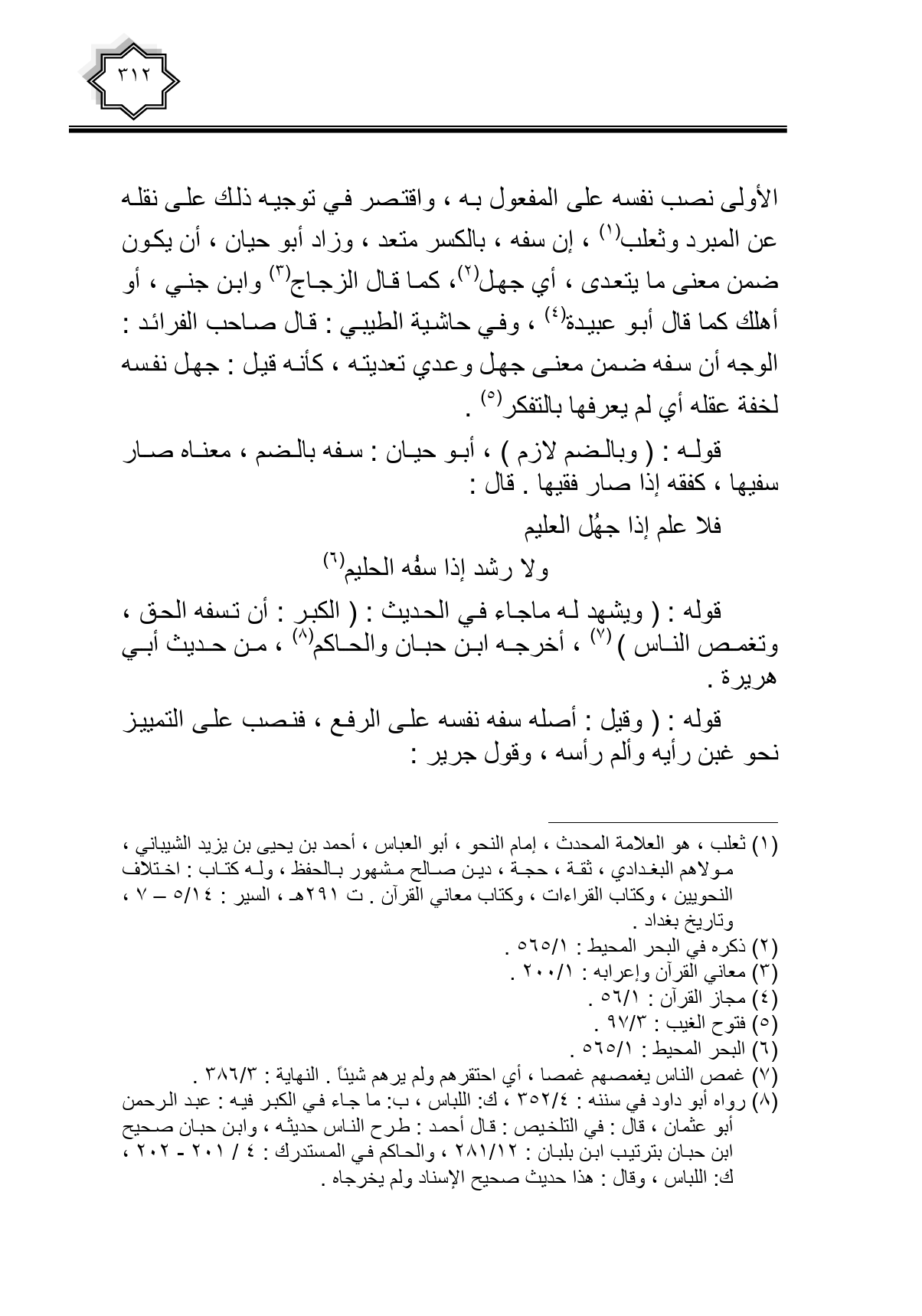 قوله: (وقيل: أصله سفه نفسه على الرفع، فنصب على التمييز نحو غبن رأيه وألم رأسه، وقول جرير: