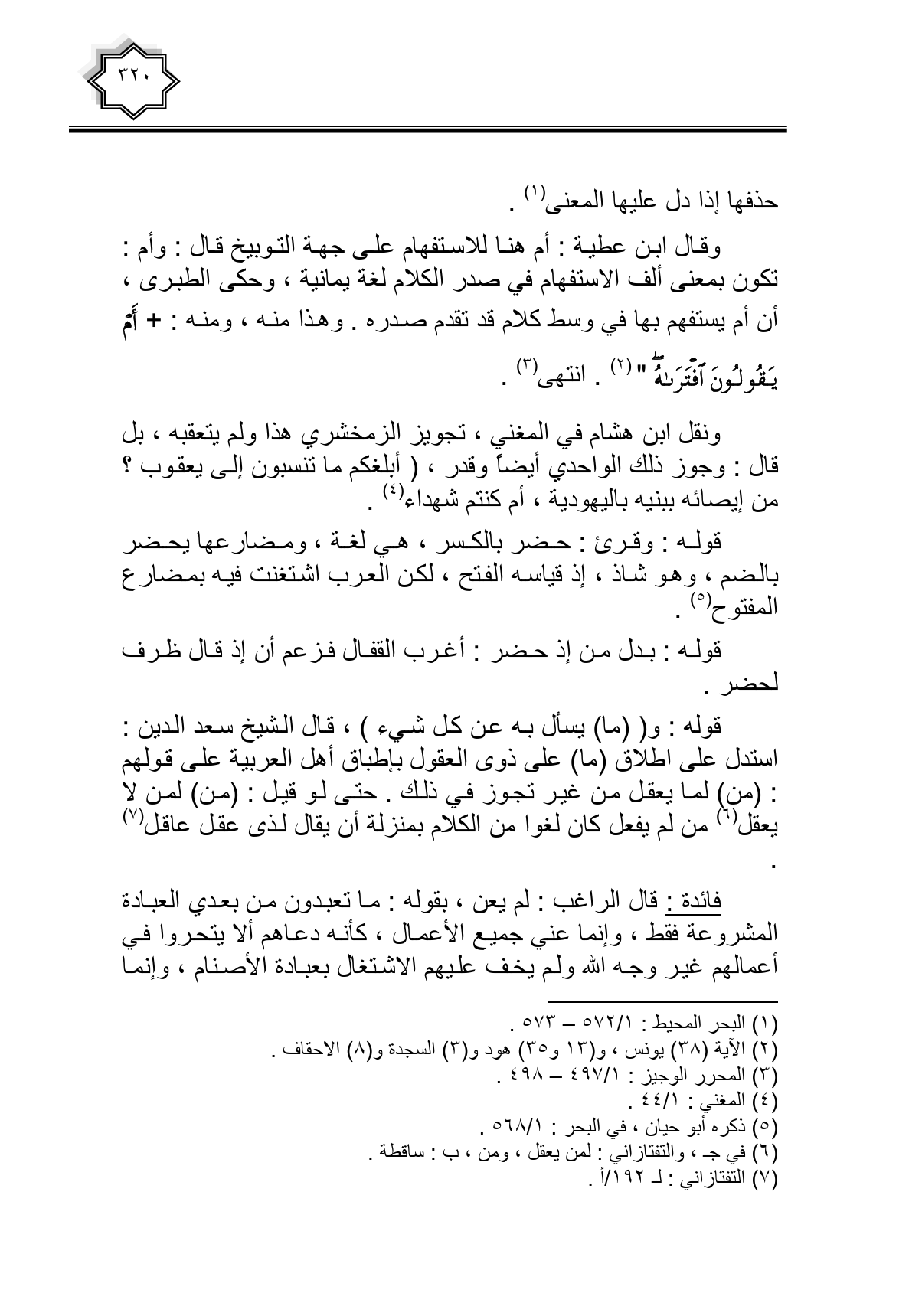 قوله: و ((ما) يسأل به عن كل شيء)، قال الشيخ سعد الدين: استدل على إطلاق (ما) على ذوى العقول بإطباق أهل العربية على قولهم: (من) لما يعقل من غير تجوز في ذلك. حتى لو قيل. (من) لمن لا يعقل من لم يفعل كان لغوا من الكلام بمنزلة أن يقال لذى عقل عاقل.
