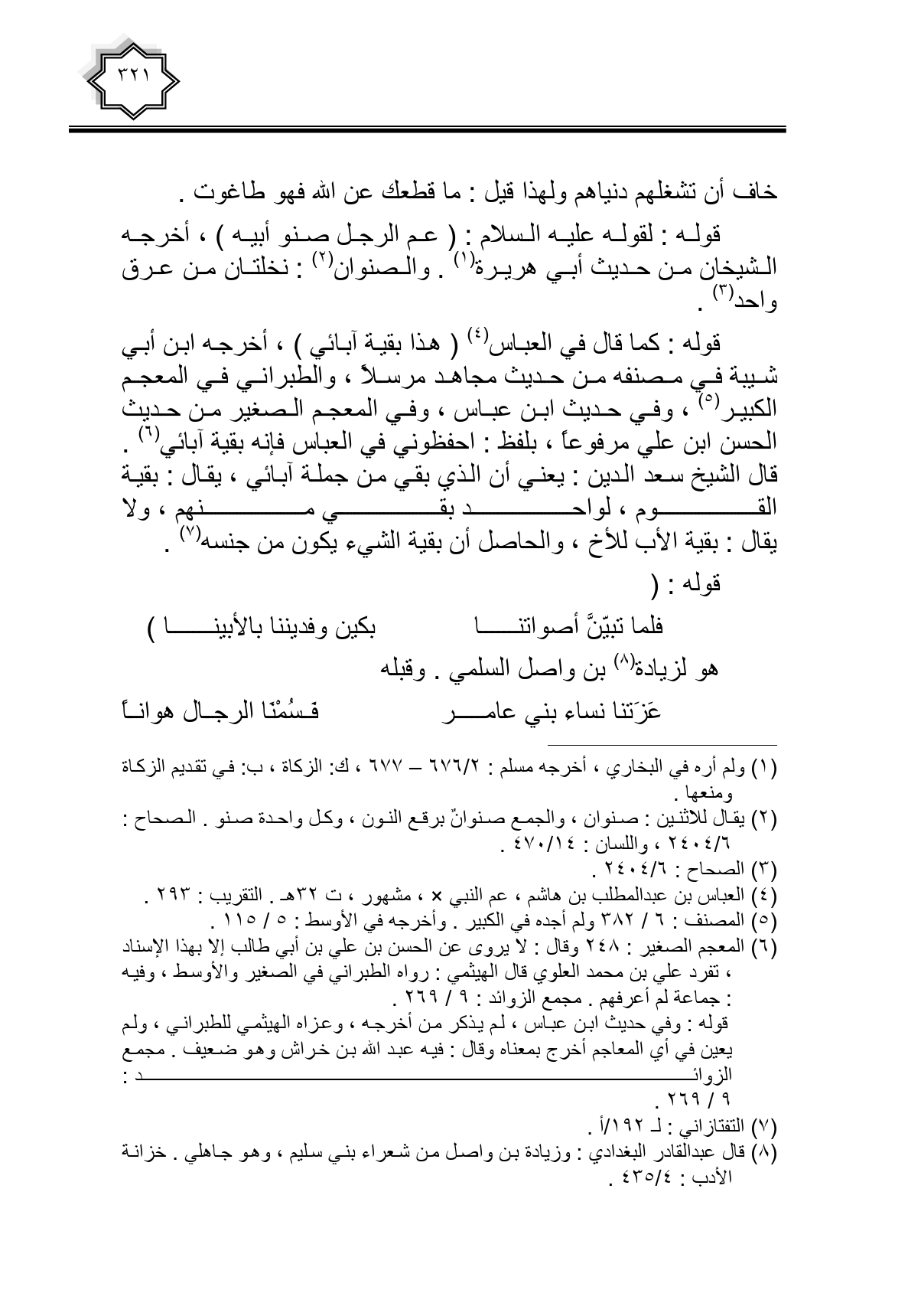 قوله: كما قال في العباس (هذا بقية آبائي)، أخرجه ابن أبي شيبة في مصنفه من حديث مجاهد مرسلا، والطبراني في المعجم الكبير، وفي حديث ابن عباس، وفي المعجم الصغير من حديث الحسن ابن علي مرفوعا، بلفظ: احفظوني في العباس فإنه بقية أبائي. قال الشيخ سعد الدين: يعني أن الذي بقي من جملة أبائي، يقال: بقية القوم، لواحد بقي منهم، ولا يقال: بقية الأب للأخ، والحاصل أن بقية الشيء يكون من جنسه.