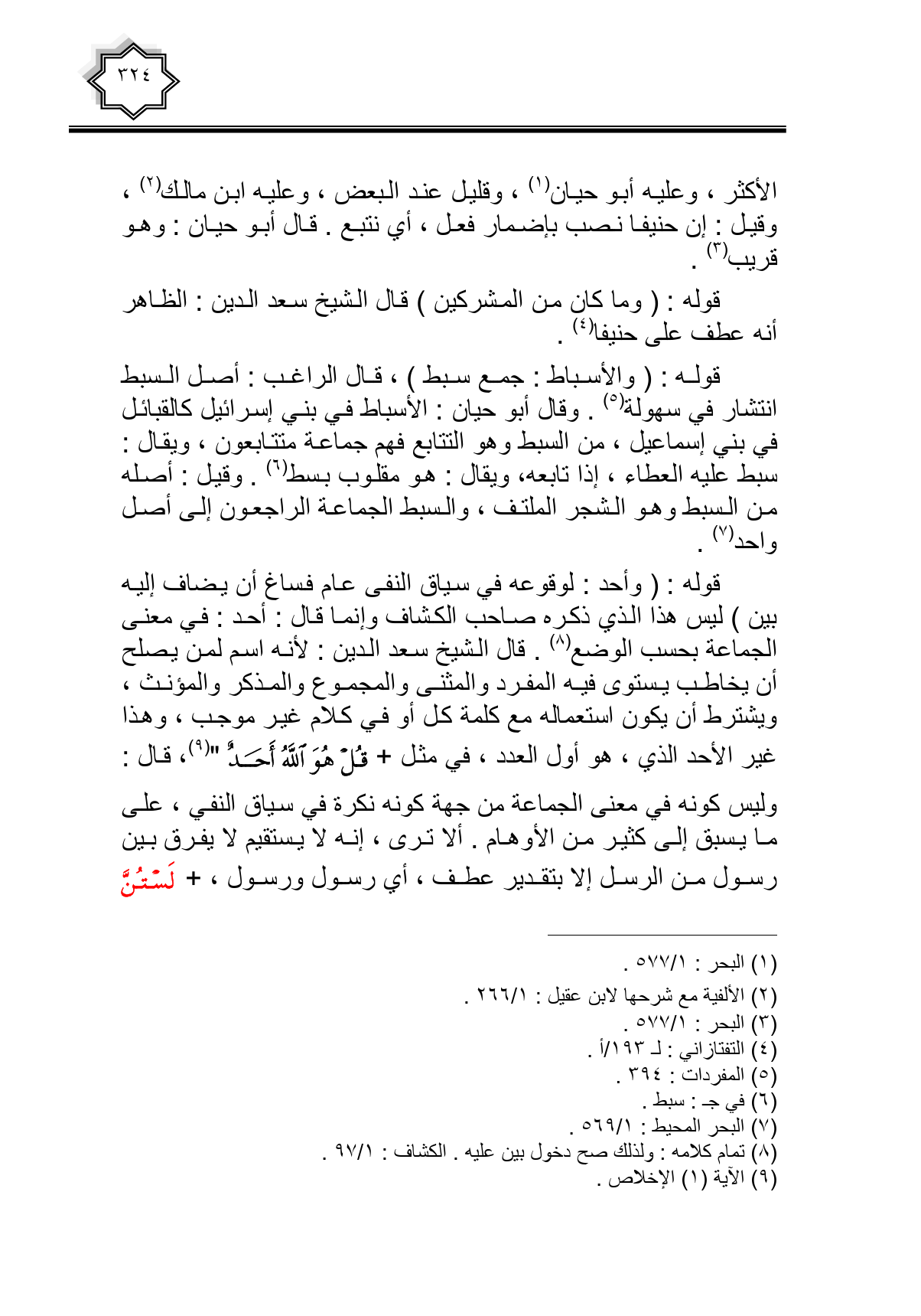 قوله: (واحد: لوقوعه في سياق النفي عام فساغ أن يضاف إليه بين) ليس هذا الذي ذكره صاحب الكشاف وإنما قال: أحد: في معنى الجماعة بحسب الوضع. قال الشيخ سعد الدين: لأنه اسم لمن يصلح أن يخاطب يستوي فيه المفرد والمثنى والمجموع والمذكر والمؤنث، ويشترط أن يكون استعماله مع كلمة كل أو في كلام غير موجب، وهذا غير الأحد الذي، هو أول العدد، في مثل {قُلْ هُوَ اللَّهُ أَحَدٌ}، قال: وليس كونه في معنى الجماعة من جهة كونه نكرة في سياق النفي، على ما يسبق إلى كثير من الأوهام. ألا ترى، إنه لا يستقيم لا يفرق بين رسول من الرسل إلا بتقدير عطف، أي رسول ورسول، {لَسْتُنَّ