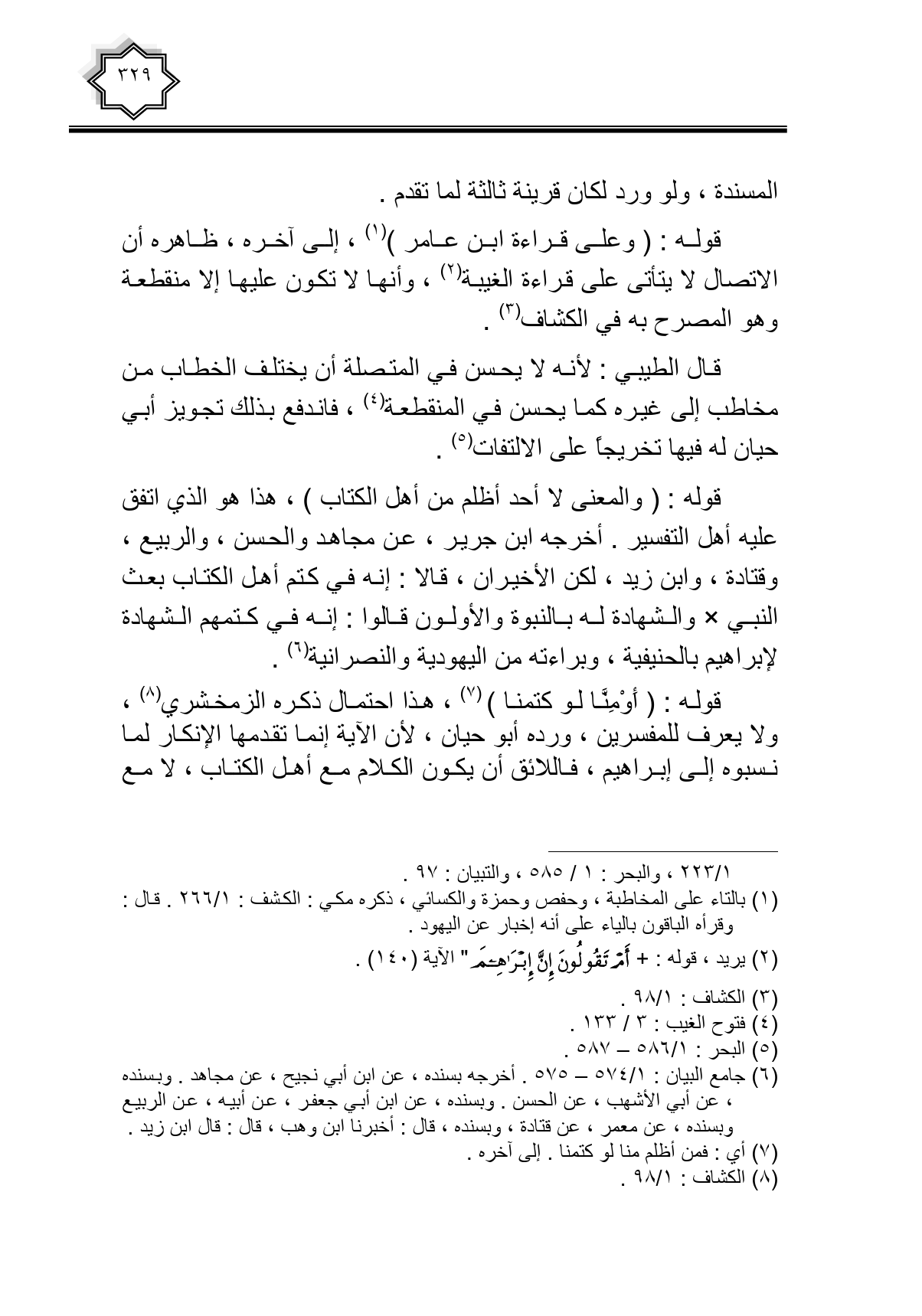 قوله: (أو منَّا لو كتمنا)، هذا احتمال ذكره الزمخشري، ولا يعرف للمفسرين، ورده أبو حيان، لأن الآية إنما تقدمها الإنكار لما نسبوه إلى إبراهيم، فاللائق أن يكون الكلام مع أهل الكتاب، لا مع