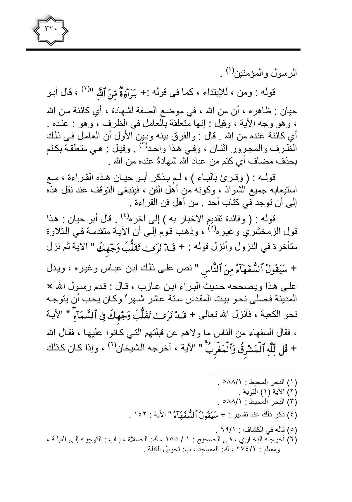 قوله: (وفائدة تقديم الإخبار به) إلى آخره. قال أبو حيان: هذا قول الزمخشري وغيره، وذهب قوم إلى أن الآية متقدمة في التلاوة متأخرة في النزول وأنزل قوله: {قَدْ نَرَى تَقَلُّبَ وَجْهِكَ} الآية ثم نزل {سَيَقُولُ السُّفَهَاءُ مِنَ النَّاسِ} نص على ذلك ابن عباس وغيره، ويدل على هذا ويصححه حديث البراء ابن عازب، قال: قدم رسول الله - صلى الله عليه وسلم - المدينة فصلى نحو بيت المقدس ستة عشر شهراً وكان يحب أن يتوجه نحو الكعبة، فأنزل الله تعالى {قَدْ نَرَى تَقَلُّبَ وَجْهِكَ فِي السَّمَاءِ} الآية، فقال السفهاء من الناس ما ولاهم عن قبلتهم التي كانوا عليها، فقال الله {قُلْ لِلَّهِ الْمَشْرِقُ وَالْمَغْرِبُ} الآية، أخرجه الشيخان، وإذا كان كذلك