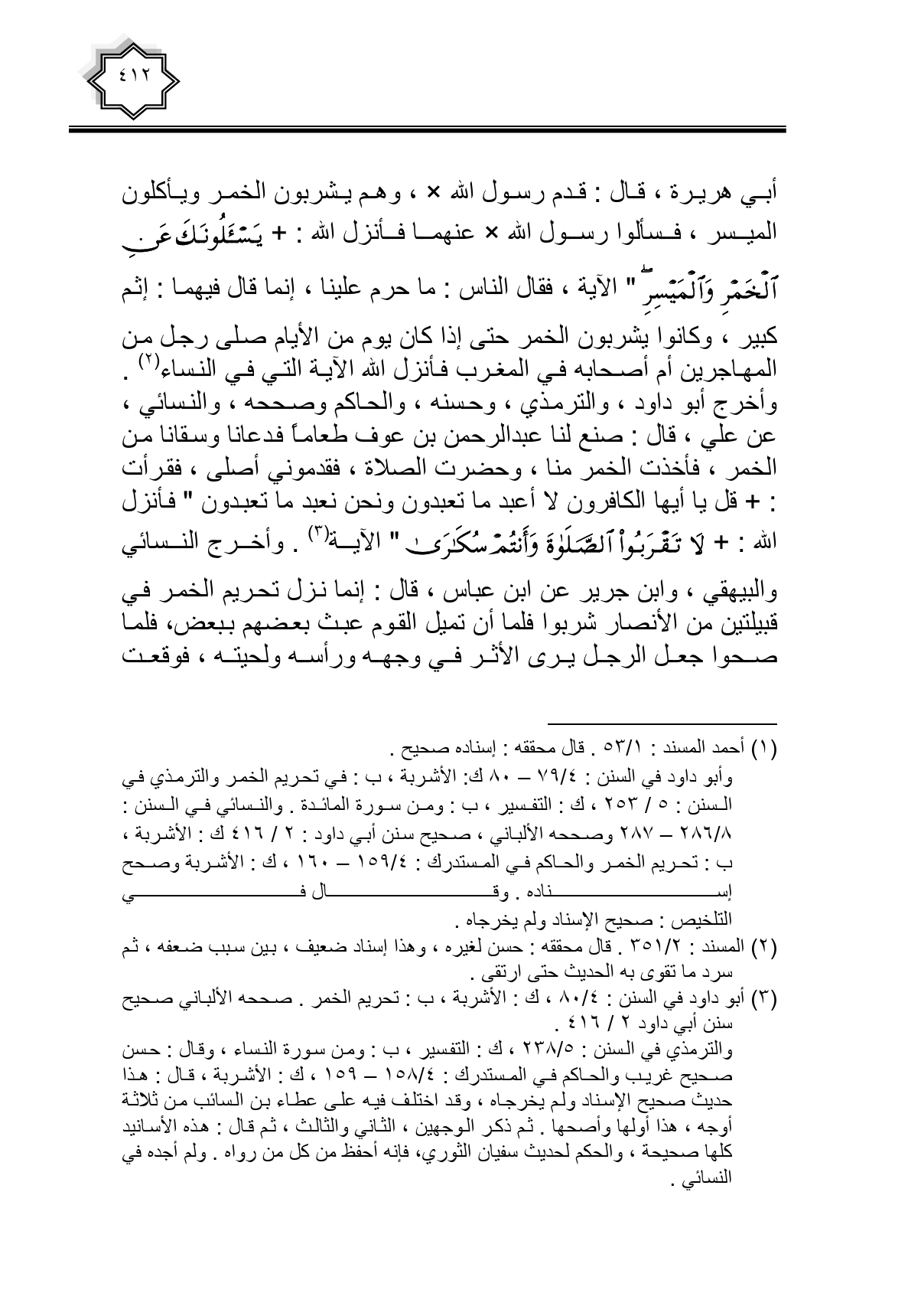 أبي هريرة، قال: قدم رسول الله - صلى الله عليه وسلم -، وهم يشربون الخمر ويأكلون الميسر، فسألوا رسول الله - صلى الله عليه وسلم - عنهما فأنزله الله: {يَسْأَلُونَكَ عَنِ الْخَمْرِ وَالْمَيْسِرِ} الآية، فقال الناس: ما حرم علينا، إنما قال فيهما: إثم كبير، وكانوا يشربون الخمر حتى إذا كان يوم من الأيام صلى رجل من المهاجرين أم أصحابه في المغرب فأنزل الله الآية التي في النساء. وأخرج أبو داود، والترمذي، وحسنه، والحاكم وصححه، والنسائي، عن علي، قال: صنع لنا عبد الرحمن بن عوف طعاما فدعانا وسقانا من الخمر، فأخذت الخمر منا، وحضرت الصلاة، فقدموني أصلى، فقرأت: {قُلْ يَا أَيُّهَا الْكَافِرُونَ لَا أَعْبُدُ مَا تَعْبُدُونَ ونحن نعبد ما تعبدون} فأنزل الله: {لَا تَقْرَبُوا الصَّلَاةَ وَأَنْتُمْ سُكَارَى} الآية. وأخرج النسائي والبيهقي، وابن جرير عن ابن عباس، قال: إنما نزل تحريم الخمر في قبيلتين من الأنصار شربوا فلما أن تميل القوم عبث بعضهم ببعض، فلما صحوا جعل الرجل يرى الأثر في وجهه ورأسه ولحيته، فوقعت