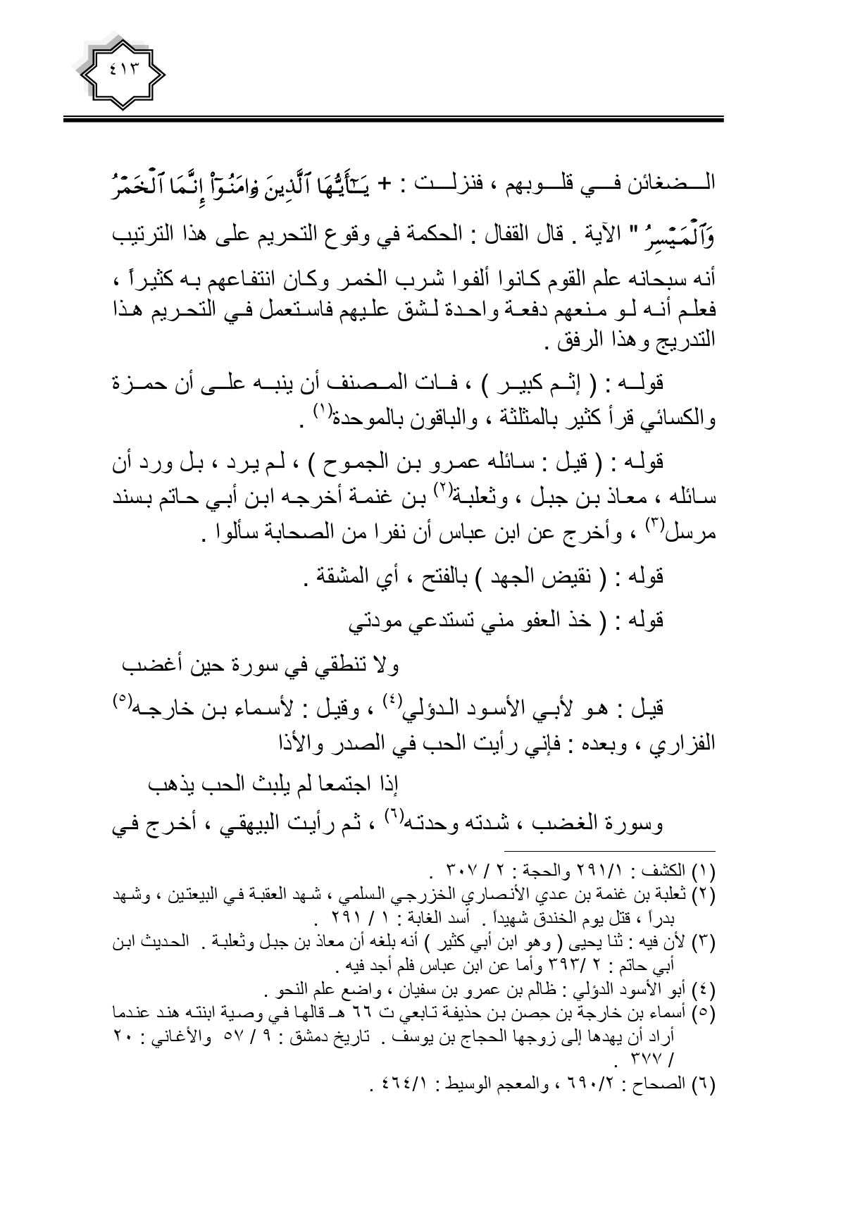 الضغائن في قلوبهم، فنزلت: {يَا أَيُّهَا الَّذِينَ آمَنُوا إِنَّمَا الْخَمْرُ وَالْمَيْسِرُ} الآية. قال القفال: الحكمة في وقوع التحريم على هذا الترتيب أنه سبحانه علم القوم كانوا كلفوا شرب الخمر وكان انتفاعهم به كثيراً، فعلم أنه لو منعهم دفعة واحدة لشق عليهم فاستعمل في التحريم هذا التدريج وهذا الرفق.
