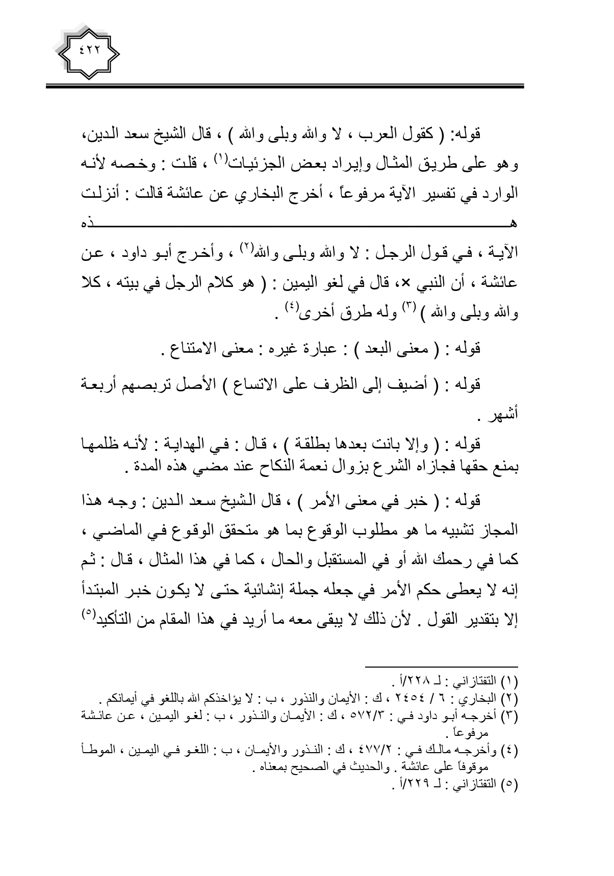 قوله: (كقول العرب، لا والله وبلى والله)، قال الشيخ سعد الدين، وهو على طريق المثال وإيراد بعض الجزئيات، قلت: وخصه لأنه الوارد في تفسير الآية مرفوعا، أخرج البخاري عن عائشة قالت: أنزلت هذه الآية، في قول الرجل: لا والله وبلى والله، وأخرج أبو داود، عن عائشة، أن النبي - صلى الله عليه وسلم -، قال في لغو اليمين: (هو كلام الرجل في بيته، كلا والله وبلى والله) وله طرق أخرى.