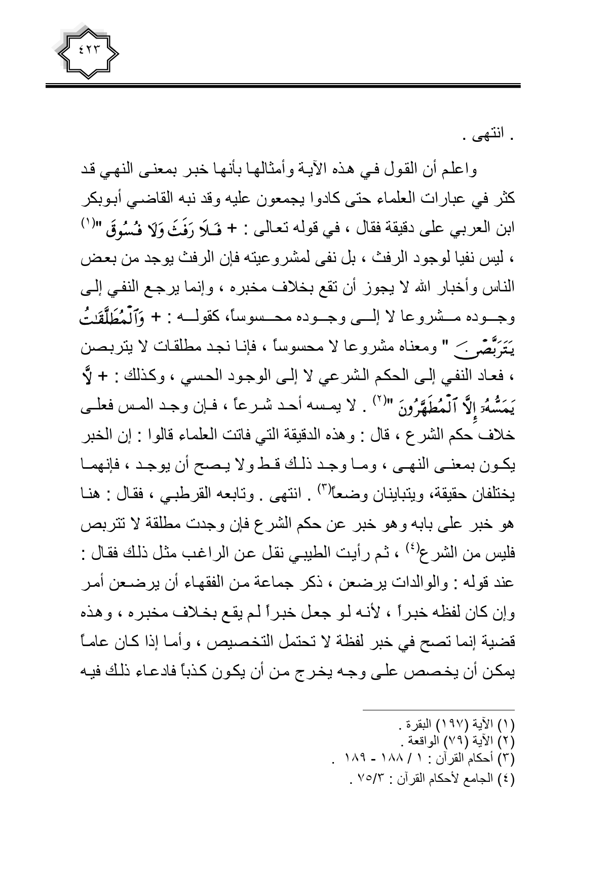 واعلم أن القول في هذه الآية وأمثالها بأنها خبر بمعنى النهي قد كثر في عبارات العلماء حتى كادوا يجمعون عليه وقد نبه القاضي أبو بكر ابن العربي على دقيقة فقال، في قوله تعالى: {فَلَا رَفَثَ وَلَا فُسُوقَ}، ليس نفيا لوجود الرفث، بل نفى لمشروعيته فإن الرفث يوجد من بعض الناس وأخبار الله لا يجوز أن تقع بخلاف مخبره، وإنما يرجع النفي إلى وجوده مشروعا لا إلى وجوده محسوسا، كقوله: {وَالْمُطَلَّقَاتُ يَتَرَبَّصْنَ} ومعناه مشروعا لا محسوسا، فإنا نجد مطلقات لا يتربصن، فعاد النفي إلى الحكم الشرعي لا إلى الوجود الحسي، وكذلك: {لَا يَمَسُّهُ إِلَّا الْمُطَهَّرُونَ}. لا يمسه أحد شرعا، فإن وجد المس فعلى خلاف حكم الشرع، قال: وهذه الدقيقة التي فاتت العلماء قالوا: إن الخبر يكون بمعنى النهي، وما وجد ذلك قط ولا يصح أن يوجد، فإنهما يختلفان حقيقة، ويتباينان وضعا. انتهى. وتابعه القرطبي، فقال: هنا هو خبر على بابه وهو خبر عن حكم الشرع فإن وجدت مطلقة لا تتربص فليس من الشرع، ثم رأيت الطيبي نقل عن الراغب مثل ذلك فقال: عند قوله والوالدات يرضعن، ذكر جماعة من الفقهاء أن يرضعن أمر وإن كان لفظه خبراً، لأنه لو جعل خبرا لم يقع بخلاف مخبره، وهذه قضية إنما تصح في خبر لفظة لا تحتمل التخصيص، وأما إذا كان عاما يمكن أن يخصص على وجه يخرج من أن يكون كذبا فادعاء ذلك فيه