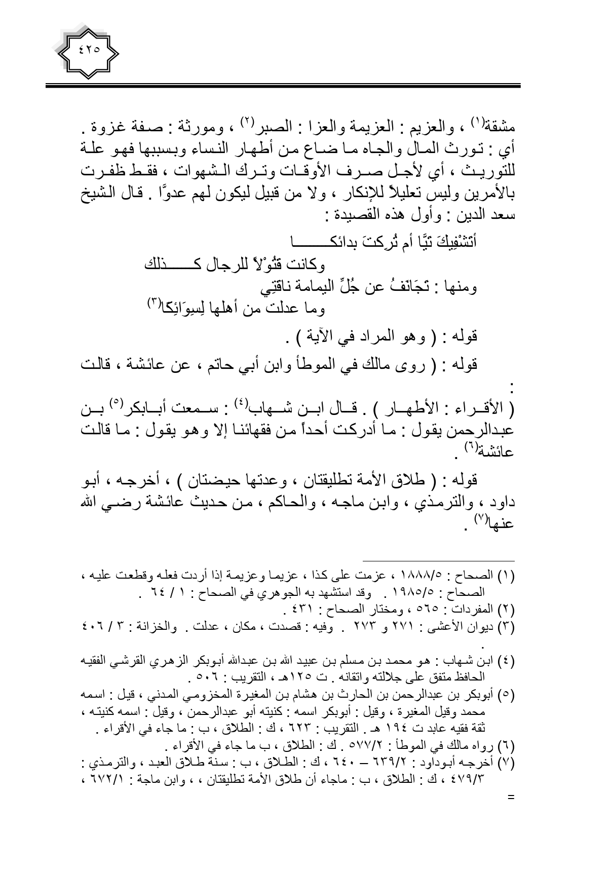 مشقة، والعزيم: العزيمة والعزا: الصبر، ومورثة: صفة غزوة. أي: تورث المال والجاه ما ضاع من أطهار النساء وبسببها فهو علة للتوريث، أي لأجل صرف الأوقات وترك الشهوات، فقط ظفرت بالأمرين وليس تعليلا للإنكار، ولا من قبيل ليكون لهم عدوا. قال الشيخ سعد الدين: وأول هذه القصيدة: