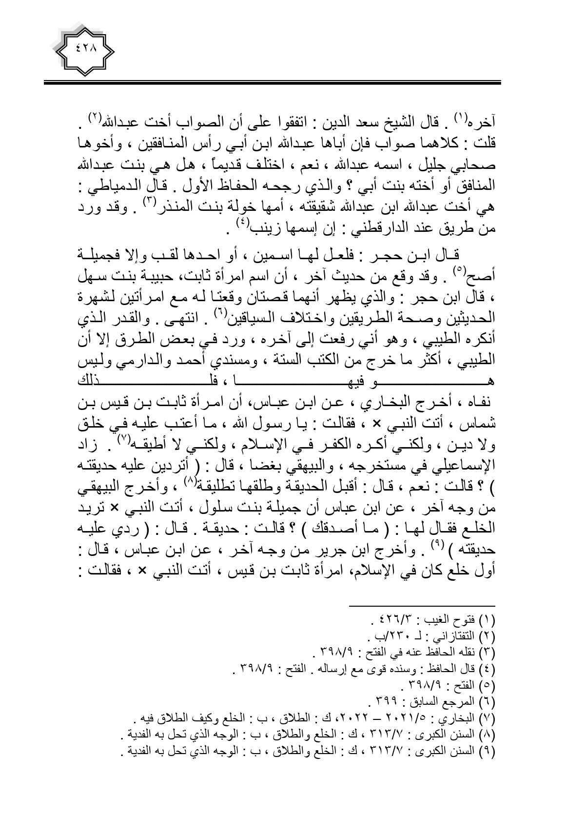 قال ابن حجر: فلعل لها اسمين، أو احدها لقب وإلا فجميلة أصح. وقد وقع من حديث آخر، أن اسم امرأة ثابت، حبيبة بنت سهل، قال ابن حجر: والذي يظهر أنهما قصتان وقعتا له مع امرأتين لشهرة الحديثين وصحة الطريقين واختلاف السياقين. انتهى. والقدر الذي أنكره الطيبي، وهو أني رفعت إلى أخره، ورد في بعض الطرق إلا أن الطيبي، أكثر ما خرج من الكتب الستة، ومسندي أحمد والدارمي وليس هو فيها، فلذلك نفاه، أخرج البخاري، عن ابن عباس، أن امرأة ثابت بن قيس بن شماس، أتت النبي - صلى الله عليه وسلم -، فقالت: يا رسول الله، ما أعتب عليه في خلق ولا دين، ولكني أكره الكفر في الإسلام، ولكني لا أطيقه. زاد الإسماعيلي في مستخرجه، والبيهقي بغضا، قال: (أتردين عليه حديقته)؟ قالت: نعم، قال: أقبل الحديقة وطلقها تطليقة، وأخرج البيهقي من وجه آخر، عن ابن عباس أن جميلة بنت سلول، أتت النبي - صلى الله عليه وسلم - تريد الخلع فقال لها: (ما أصدقك)؟ قالت: حديقة. قال: (ردي عليه حديقته). وأخرج ابن جرير من وجه أخر، عن ابن عباس، قال: أول خلع كان في الإسلام، امرأة ثابت بن قيس، أتت النبي - صلى الله عليه وسلم -، فقالت: