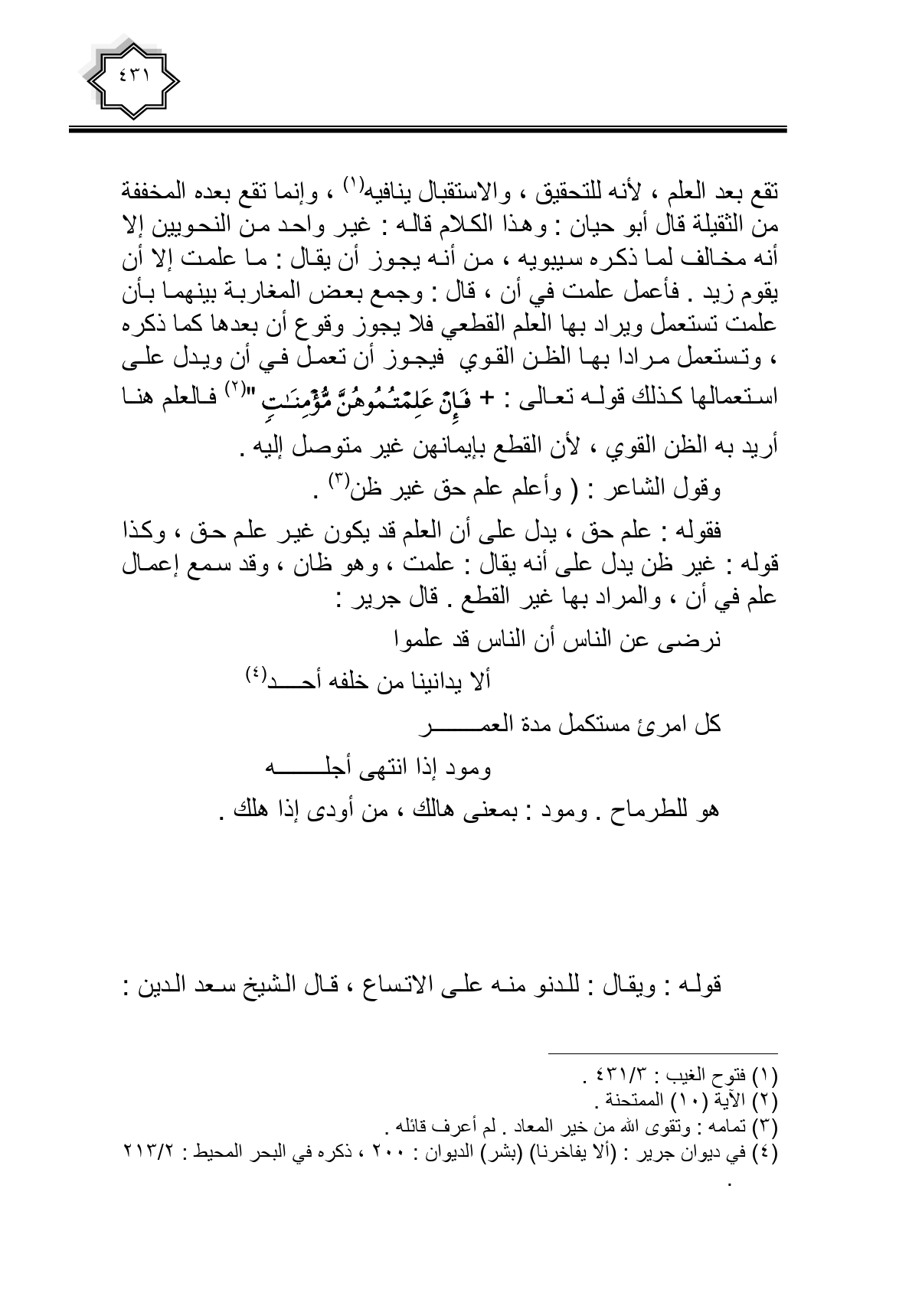 فقوله: علم حق، يدل على أن العلم قد يكون غير علم حق، وكذا قوله: غير ظن يدل على أنه يقال: علمت، وهو ظان، وقد سمع إعمال علم في أن، والمراد بها غير القطع. قال جرير: