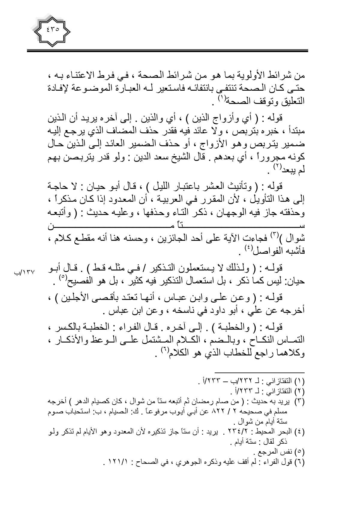 قوله: (وتأنيث العشر باعتبار الليل)، قال أبو حيان: لا حاجة إلى هذا التأويل، لأن المقرر في العربية، أن المعدود إذا كان مذكراً، وحذفته جاز فيه الوجهان، ذكر التاء وحذفها، وعليه حديث: (وأتبعه