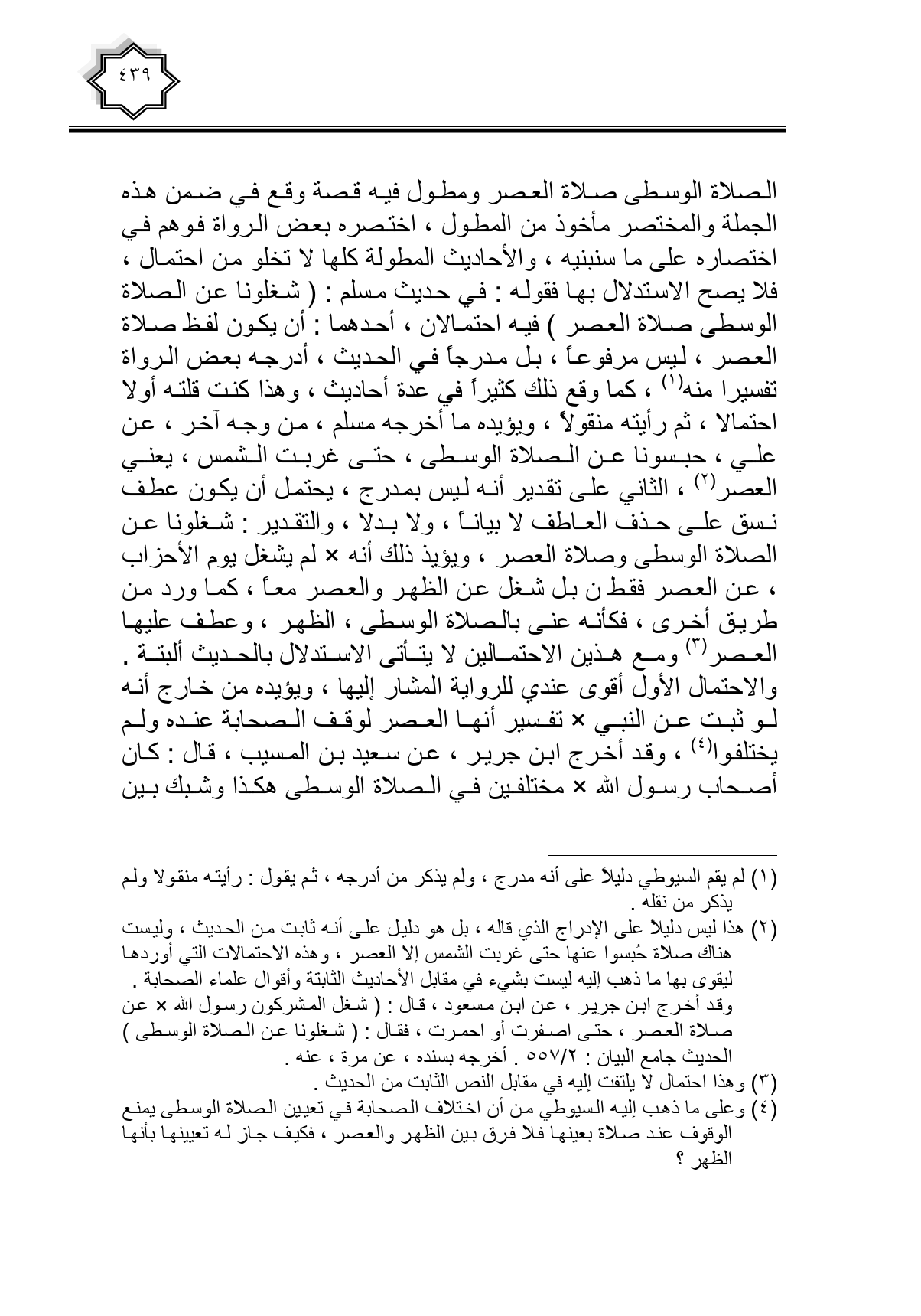 الصلاة الوسطى صلاة العصر ومطول فيه قصة وقع في ضمن هذه الجملة والمختصر مأخوذ من المطول، اختصره بعض الرواة فوهم في اختصاره على ما سنبنيه، والأحاديث المطولة كلها لا تخلو من احتمال، فلا يصح الاستدلال بها فقوله: في حديث مسلم: (شغلونا عن الصلاة الوسطى صلاة العصر) فيه احتمالان، أحدهما: أن يكون لفظ صلاة العصر، ليس مرفوعا، بل مدرجا في الحديث، أدرجه بعض الرواة تفسيرا منه، كما وقع ذلك كثيرا في عدة أحاديث، وهذا كنت قلته أولا احتمالا، ثم رأيته منقولا، ويؤيده ما أخرجه مسلم، من وجه آخر، عن علي، حبسونا عن الصلاة الوسطى، حتى غربت الشمس، يعني العصر، الثاني على تقدير أنه ليس بمدرج، يحتمل أن يكون عطف نسق على حذف العاطف لا بيانا، ولا بدلا، والتقدير: شغلونا عن الصلاة الوسطى وصلاة العصر، ويؤيد ذلك أنه - صلى الله عليه وسلم - لم يشغل يوم الأحزاب، عن العصر فقط ن بل شغل عن الظهر والعصر معا، كما ورد من طريق أخرى، فكأنه عنى بالصلاة الوسطى، الظهر، وعطف عليها العصر ومع هذين الاحتمالين لا يتأتى الاستدلال بالحديث ألبتة. والاحتمال الأول أقوى عندي للرواية المشار إليها، ويؤيده من خارج أنه لو ثبت عن النبي - صلى الله عليه وسلم - تفسير أنها العصر لوقف الصحابة عنده ولم يختلفوا، وقد أخرج ابن جرير، عن سعيد بن المسيب، قال: كان أصحاب رسول الله - صلى الله عليه وسلم - مختلفين في الصلاة الوسطى هكذا وشبك بين