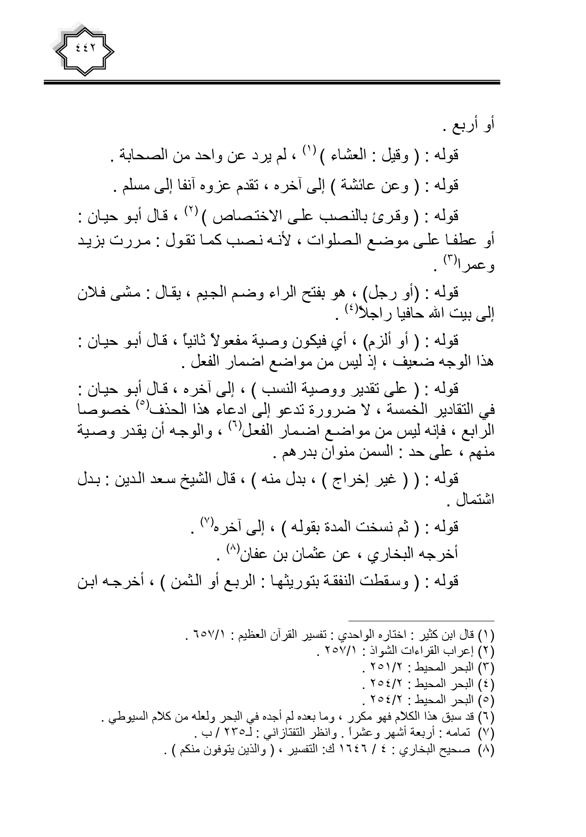 قوله: (على تقدير ووصية النسب)، إلى آخره، قال أبو حيان: في التقادير الخمسة، لا ضرورة تدعو إلى ادعاء هذا الحذف خصوصا الرابع، فإنه ليس من مواضع إضمار الفعل، والوجه أن يصدر وصية منهم، على حد: السمن منوان بدرهم.