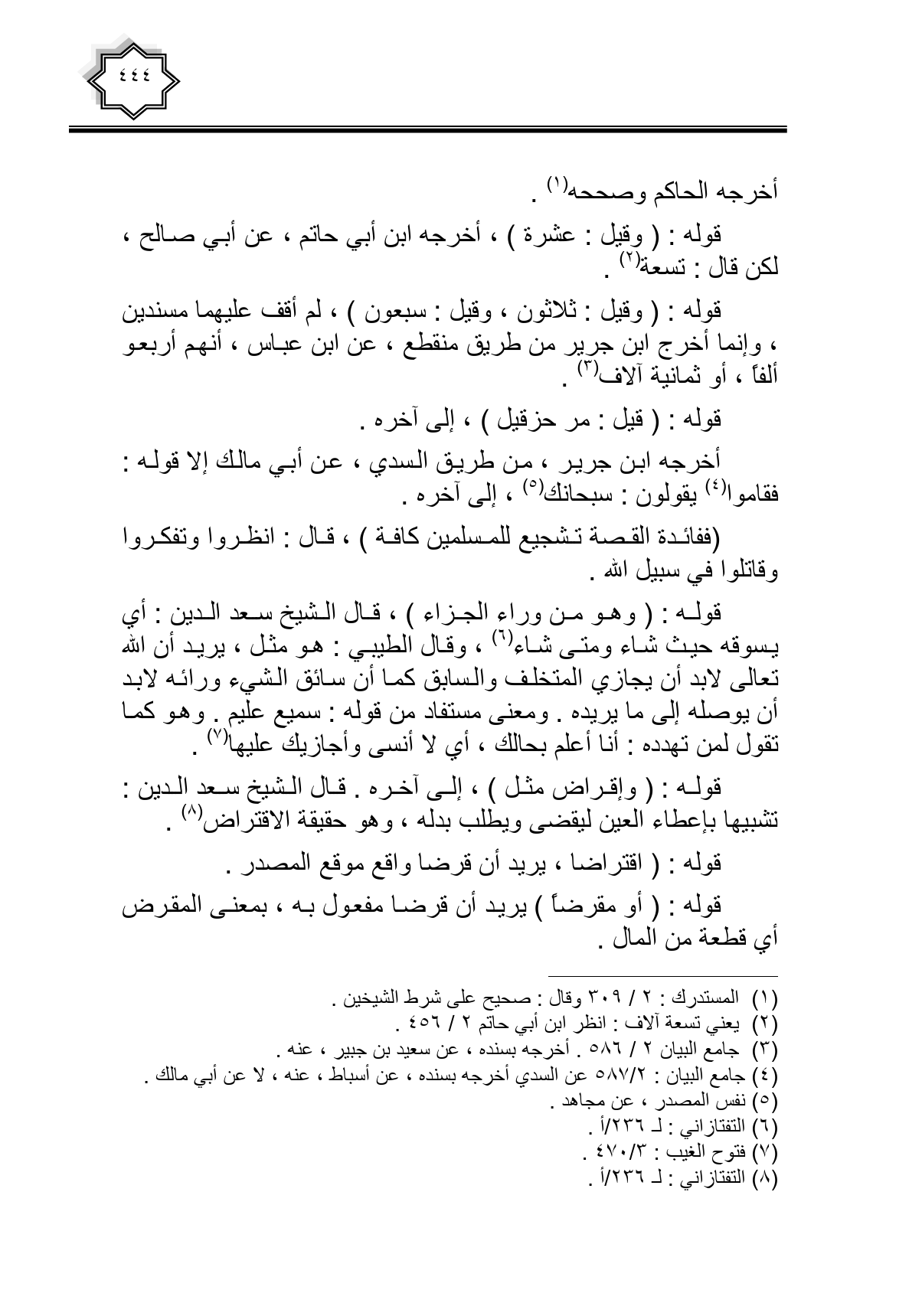 قوله: (وهو من وراء الجزاء)، قال الشيخ سعد الدين: أي يسوقه حيث شاء ومتى شاء، وقال الطيبي: هو مثل، يريد أن الله تعالى لابد أن يجازي المتخلف والسابق كما أن سائق الشيء ورائه لابد أن يوصله إلى ما يريده. ومعنى مستفاد من قوله: سميع عليم. وهو كما تقول لمن تهدده: أنا أعلم بحالك، أي لا أنسى وأجازيك عليها.