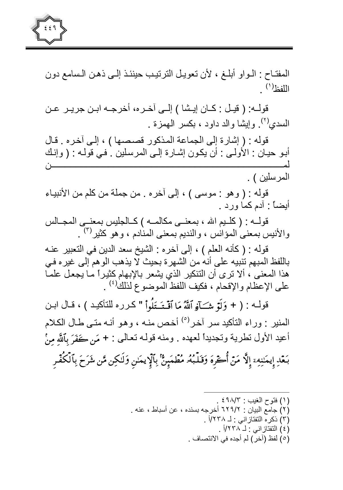 قوله: ({وَلَوْ شَاءَ اللَّهُ مَا اقْتَتَلُوا} كرره للتأكيد)، قال ابن المنير: وراء التأكيد سر آخر أخص منه، وهو أنه متى طال الكلام أعيد الأول تطرية وتجديداً لعهده. ومنه قوله تعالى: {مَنْ كَفَرَ بِاللَّهِ مِنْ بَعْدِ إِيمَانِهِ إِلَّا مَنْ أُكْرِهَ وَقَلْبُهُ مُطْمَئِنٌّ بِالْإِيمَانِ وَلَكِنْ مَنْ شَرَحَ بِالْكُفْرِ