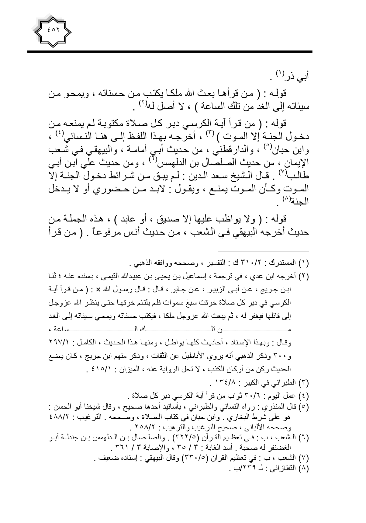 قوله: (من قرأ آية الكرسي دبر كل صلاة مكتوبة لم يمنعه من دخول الجنة إلا الموت)، أخرجه بهذا اللفظ إلى هنا النسائي، وابن حبان، والدارقطني، من حديث أبي أمامة، والبيهقي في شعب الإيمان، من حديث الصلصال بن الدلهمس، ومن حديث علي ابن أبي طالب. قال الشيخ سعد الدين: لم يبق من شرائط دخول الجنة إلا الموت وكان الموت يمنع، ويقول: لابد من حضوري أو لا يدخل الجنة.