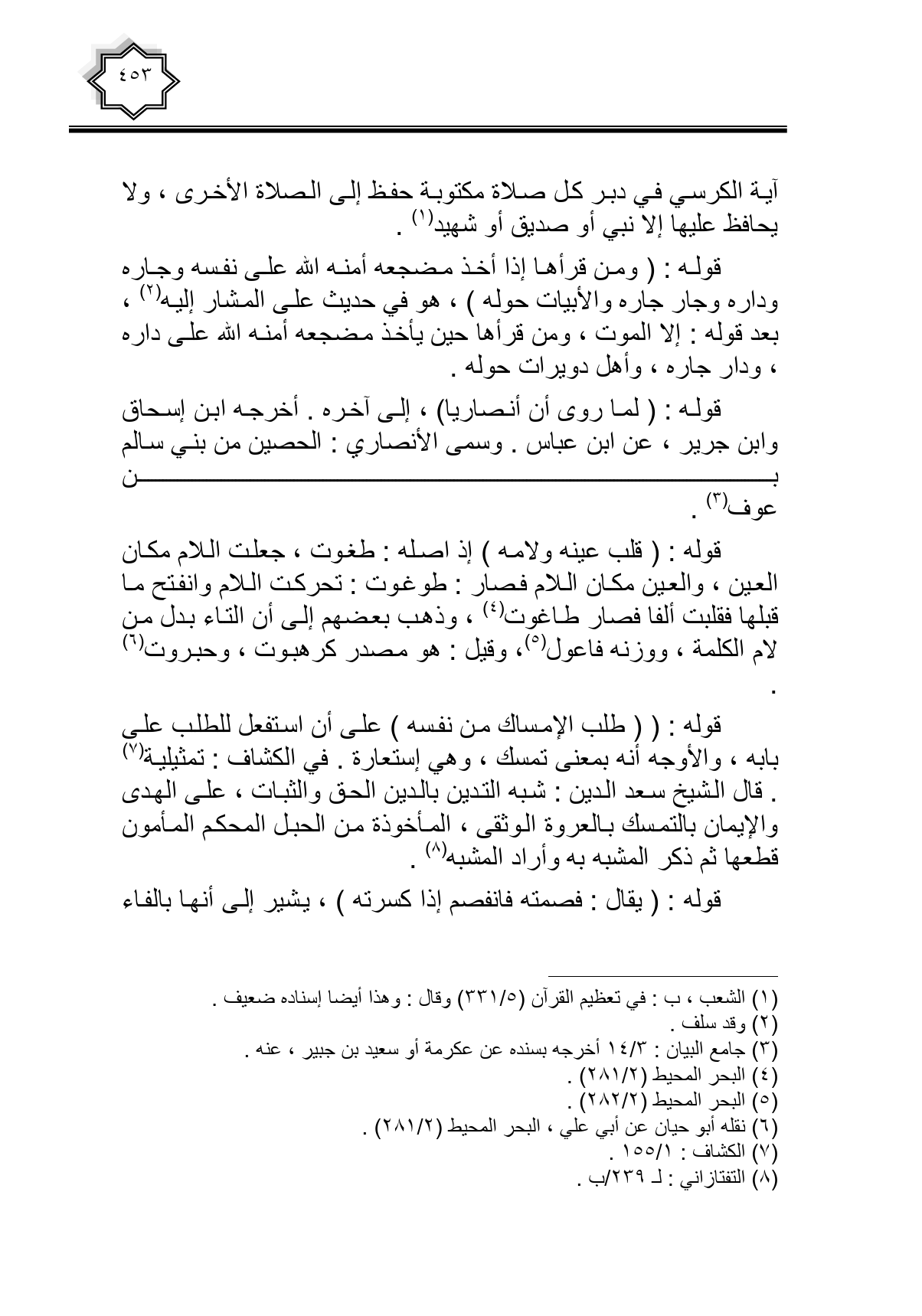 قوله: (ومن قرأها إذا أخذ مضجعه أمنه الله على نفسه وجاره وداره وجار جاره والأبيات حوله)، هو في حديث على المشار إليه، بعد قوله: إلا الموت، ومن قرأها حين يأخذ مضجعه أمنه الله على داره، ودار جاره، وأهل دويرات حوله.