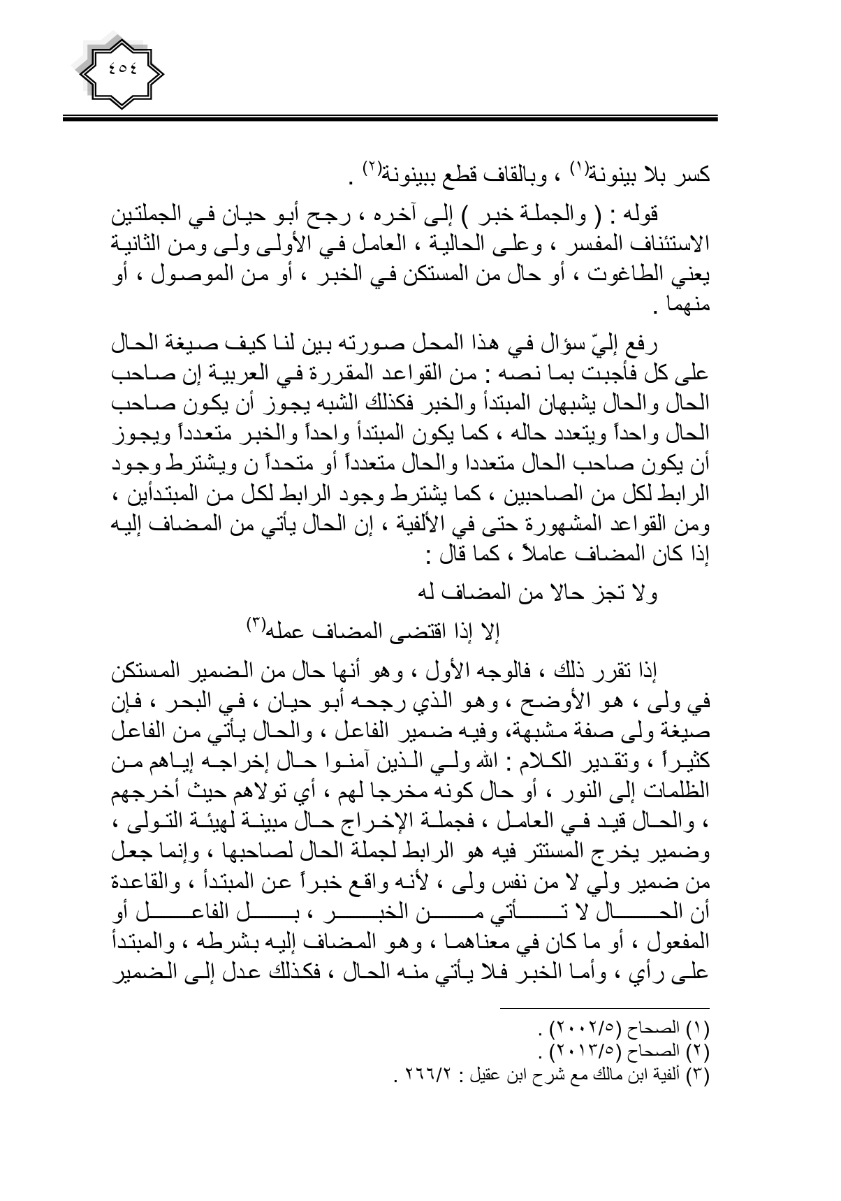 رفع إلي سؤال في هذا المحل صورته بين لنا كيف صيغة الحال على كل فأجبت بما نصه: من القواعد المقررة في العربية إن صاحب الحال والحال يشبهان المبتدأ والخبر فكذلك الشبه يجوز أن يكون صاحب الحال واحدا ويتعدد حاله، كما يكون المبتدأ واحدا والخبر متعدداً ويجوز أن يكون صاحب الحال متعددا والحال متعدداً أو متحدا، ويشترط وجود الرابط لكل من الصاحبين، كما يشترط وجود الرابط لكل من المبتدأين، ومن القواعد المشهورة حتى في الألفية، إن الحال يأتي من المضاف إليه إذا كان المضاف عاملا، كما قال: