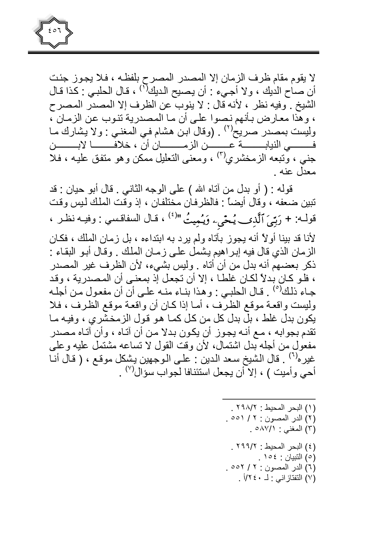 لا يقوم مقام ظرف الزمان إلا المصدر المصرح بلفظه، فلا يجوز جئت أن صاح الديك، ولا أجيء: أن يصيح الديك، قال الحلبي: كذا قال الشيخ. وفيه نظر، لأنه قال: لا ينوب عن الظرف إلا المصدر المصرح، وهذا معارض بأنهم نصوا على أن ما المصدرية تنوب عن الزمان، وليست بمصدر صريح. (وقال ابن هشام في المغني: ولا يشارك ما في النيابة عن الزمان أن، خلافا لابن جني، وتبعه الزمخشري، ومعنى التعليل ممكن وهو متفق عليه، فلا معدل عنه.