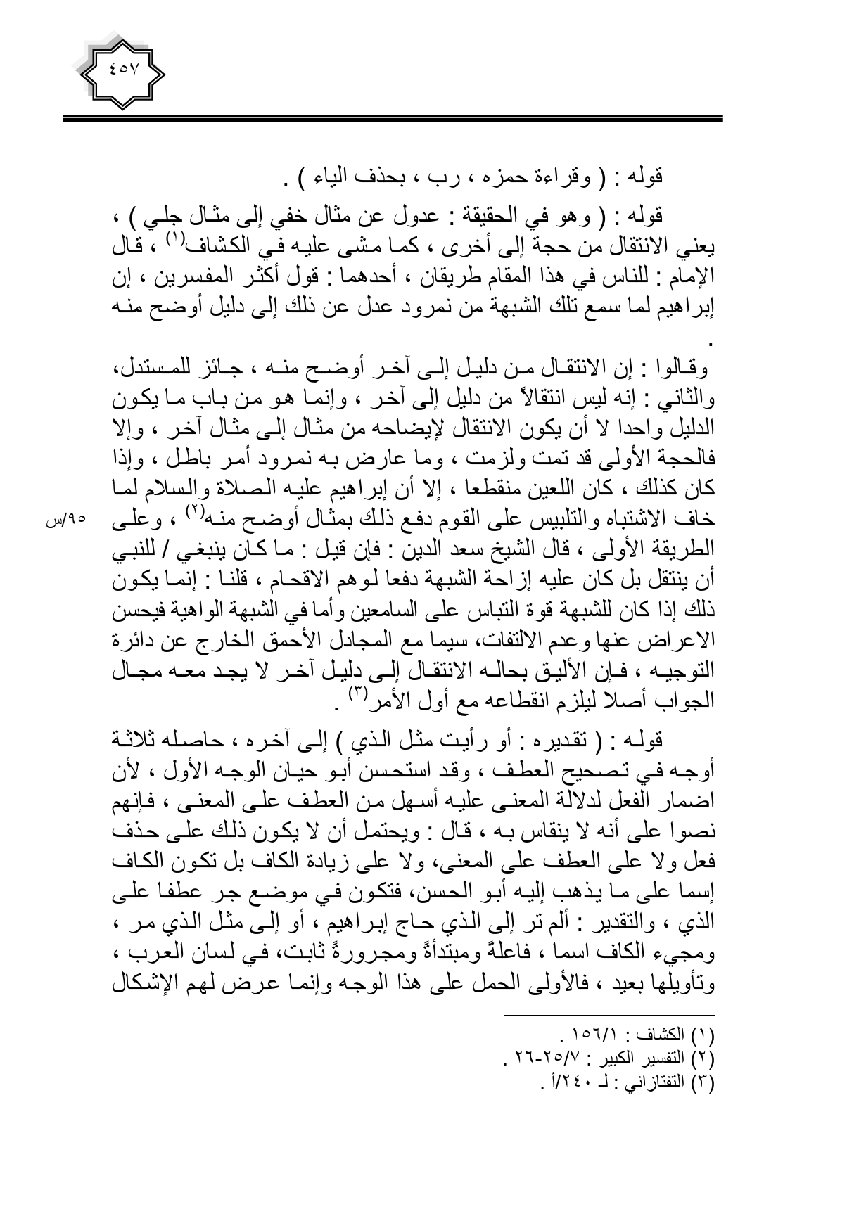 وقالوا: إن الانتقال من دليل إلى آخر أوضح منه، جائز للمستدل، والثاني: إنه ليس انتقالا من دليل إلى آخر، وإنما هو من باب ما يكون الدليل واحدا لا أن يكون الانتقال لإيضاحه من مثال إلى مثال آخر، وإلا فالحجة الأولى قد تمت ولزمت، وما عارض به نمرود أمر باطل، وإذا كان كذلك، كان اللعين منقطعا، إلا أن إبراهيم عليه الصلاة والسلام لما خاف الاشتباه والتلبيس على القوم دفع ذلك بمثال أوضح منه، وعلى الطريقة الأولى، قال الشيخ سعد الدين: فإن قيل: ما كان ينبغي/ للنبي أن ينتقل بل كان عليه إزاحة الشبهة دفعا لوهم الإقحام، قلنا: إنما يكون ذلك إذا كان للشبهة قوة التباس على السامعين وأما في الشبهة الواهية فيحسن الإعراض عنها وعدم الالتفات، سيما مع المجادل الأحمق الخارج عن دائرة التوجيه، فإن الأليق بحاله الانتقال إلى دليل آخر لا يجد معه مجال الجواب أصلا ليلزم انقطاعه مع أول الأمر.
