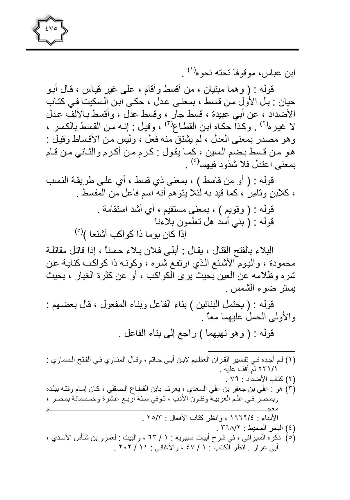 قوله: (وهما مبنيان، من أقسط وأقام، على غير قياس، قال أبو حيان: بل الأول من قسط، بمعنى عدل، حكى ابن السكيت في كتاب الأضداد، عن أبى عبيدة، قسط جار، وقسط عدل، وأقسط بالألف عدل لا غيره. وكذا حكاه ابن القطاع، وقيل: إنه من القسط بالكسر، وهو مصدر بمعنى العدل، لم يشتق منه فعل، وليس من الأقساط وقيل: هو من قسط بضم السين، كما يقول: كرم من أكرم والثاني من قام بمعنى اعتدل فلا شذود فيهما.