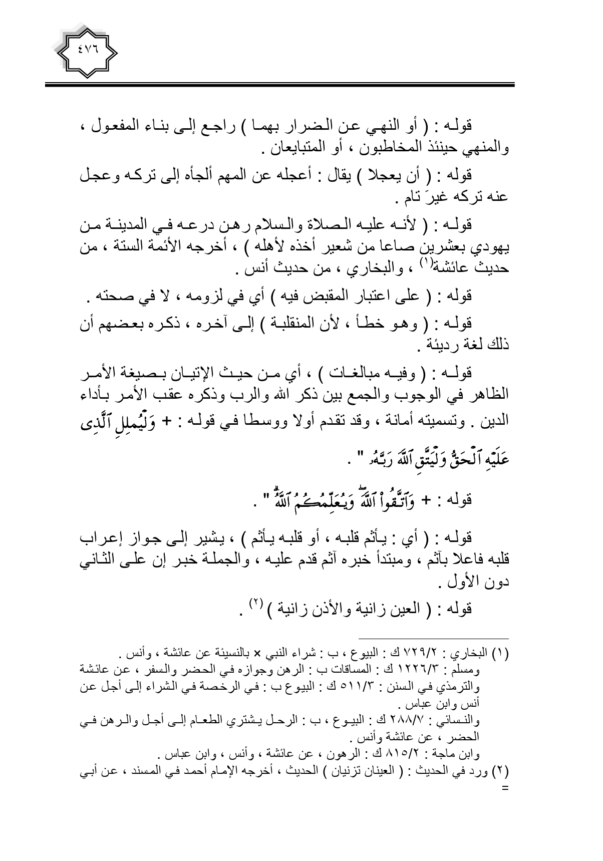 قوله: (لأنه عليه الصلاة والسلام رهن درعه في المدينة من يهودي بعشرين صاعا من شعير أخذه لأهله)، أخرجه الأئمة الستة، من حديث عائشة، والبخاري، من حديث أنس.