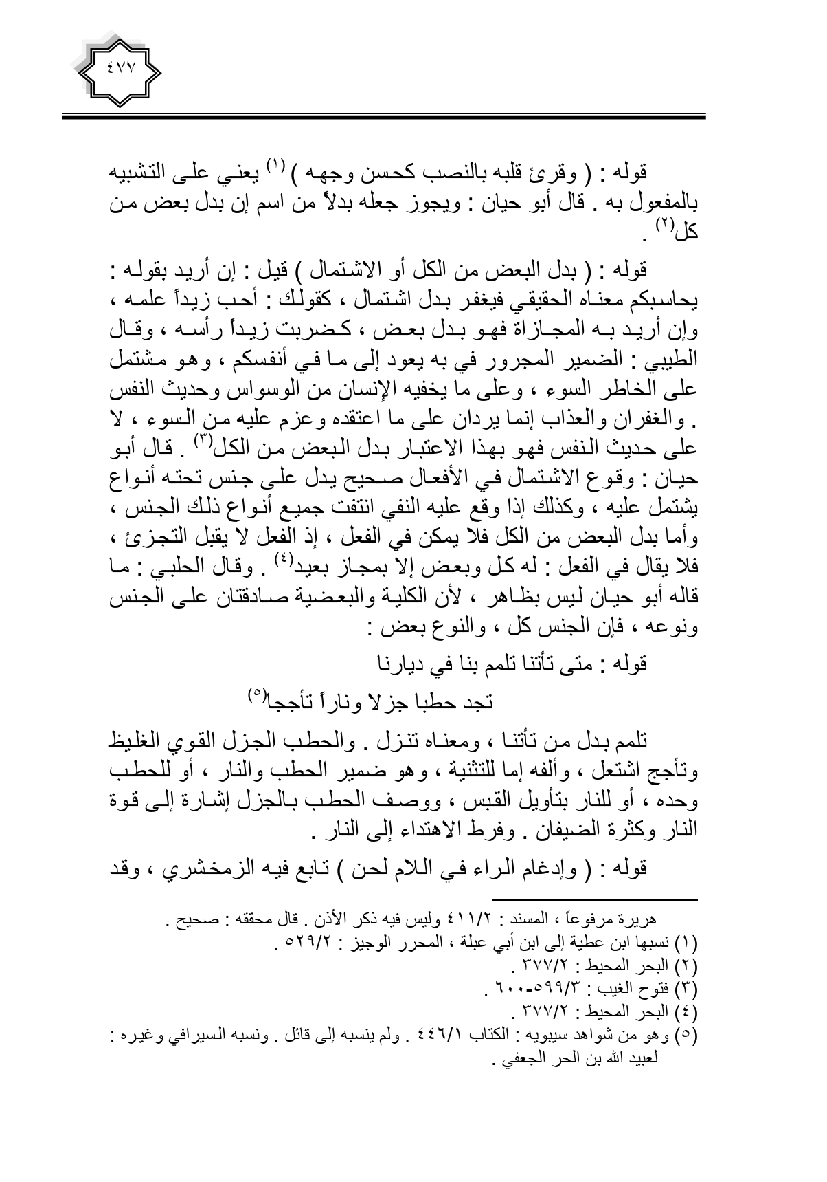 قوله: (بدل البعض من الكل أو الاشتمال) قيل: إن أريد بقوله: يحاسبكم معناه الحقيقي فيغفر بدل اشتمال، كقولك: أحب زيداً علمه، وإن أريد به المجازاة فهو بدل بعض، كضربت زيداً رأسه، وقال الطيبي: الضمير المجرور في به يعود إلى ما في أنفسكم، وهو مشتمل على الخاطر السوء، وعلى ما يخفيه الإنسان من الوسواس وحديث النفس. والغفران والعذاب إنما يردان على ما اعتقده وعزم عليه من السوء، لا على حديث النفس فهو بهذا الاعتبار بدل البعض من الكل. قال أبو حيان: وقوع الاشتمال في الأفعال صحيح يدل على جنس تحته أنواع يشتمل عليه، وكذلك إذا وقع عليه النفي انتفت جميع أنواع ذلك الجنس، وأما بدل البعض من الكل فلا يمكن في الفعل، إذ الفعل لا يقبل التجزئ، فلا يقال في الفعل: له كل وبعض إلا بمجاز بعيد. وقال الحلبي: ما قاله أبو حيان ليس بظاهر، لأن الكلية والبعضية صادقتان على الجنس ونوعه، فإن الجنس كل، والنوع بعض: