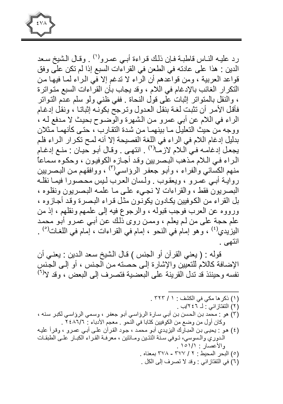 رد عليه الناس قاطبة فإن ذلك قراءة أبي عمرو. وقال الشيخ سعد الدين: هذا على عادته في الطعن في القراءات السبع إذا لم تكن على وفق قواعد العربية، ومن قواعدهم أن الراء لا تدغم إلا في الراء لما فيها من التكرار الغائب بالإدغام في اللام، وقد يجاب بأن القراءات السبع متواترة، والنقلة بالمتواتر إثبات على قول النحاة. ففي ظني ولو سلم عدم التواتر فأقل الأمر أن تثبت لغة بنقل العدول وترجح بكونه إثباتا، ونقل إدغام الراء في اللام عن أبي عمرو من الشهرة والوضوح بحيث لا مدفع له، ووجه من حيث التعليل ما بينهما من شدة التقارب، حتى كأنهما مثلان بدليل إدغام اللام في الراء في اللغة الفصيحة إلا أنه لمح تكرار الراء فلم يجعل إدغامه في اللام لازما. انتهى. وقال أبو حيان: منع إدغام الراء في اللام مذهب البصريين وقد أجازه الكوفيون، وحكوه سماعا منهم الكسائي والفراء، وأبو جعفر الرؤاسي، ووافقهم من البصريين رواية أبي عمرو، ويعقوب. ولسان العرب ليس محصورا فيما نقله البصريون فقط، والقراءات لا نجيء على ما علمه البصريون ونقلوه، بل القراء من الكوفيين يكادون يكونون مثل قراء البصرة وقد أجازوه، ورووه عن العرب فوجب قبوله، والرجوع فيه إلى علمهم ونقلهم، إذ من علم حجة على من لم يعلم، وممن روى ذلك عن أبي عمرو أبو محمد اليزيدي، وهو إمام في النحو، إمام في القراءات، إمام في اللغات. انتهى.
