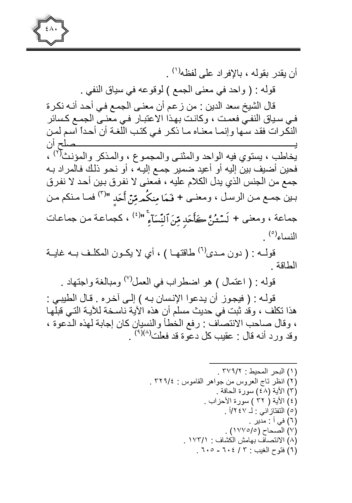 قال الشيخ سعد الدين: من زعم أن معنى الجمع في أحد أنه نكرة في سياق النفي فعمت، وكانت بهذا الاعتبار في معنى الجمع كسائر النكرات فقد سها وإنما معناه ما ذكر في كتب اللغة أن أحدا اسم لمن