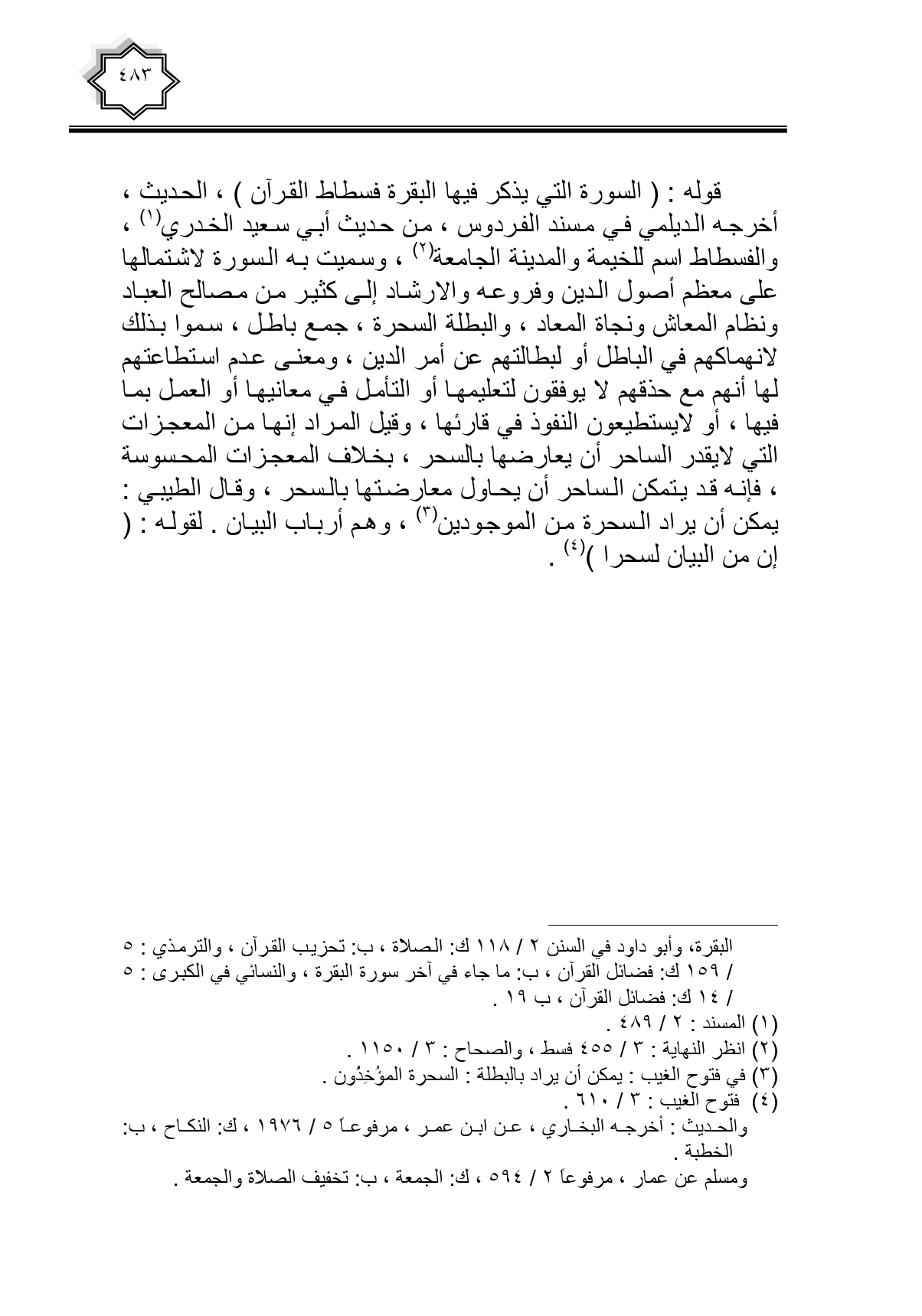 قوله: (السورة التي يذكر فيها البقرة فسطاط القرآن)، الحديث، أخرجه الديلمي في مسند الفردوس، من حديث أبي سعيد الخدري، بالفسطاط اسم للخيمة والمدينة الجامعة، وسميت به السورة لاشتمالها على معظم أصول الدين وفروعه والإرشاد إلى كثير من مصالح العباد ونظام المعاش ونجاة المعاد، والبطلة السحرة، جمع باطل، سموا بذلك لانهماكهم أو الباطل أو لبطالتهم عن أمر الدين، ومعنى عدم استطاعتهم لها أنهم مع حذقهم لا يوفقون لتعليمها أو التأمل في معانيها أو العمل بما فيها، أو لايستطيعون النفوذ في قارئها، وقيل المراد إنها من المعجزات التي لايقدر الساحر أن يعارضها بالسحر، بخلاف المعجزات المحسوسة، فإنه قد يتمكن الساحر أن يحاول معارضتها بالسحر، وقال الطيبي: يمكن أن يراد السحرة من الموجودين، وهم أرباب البيان. لقوله: (إن من البيان لسحرا).