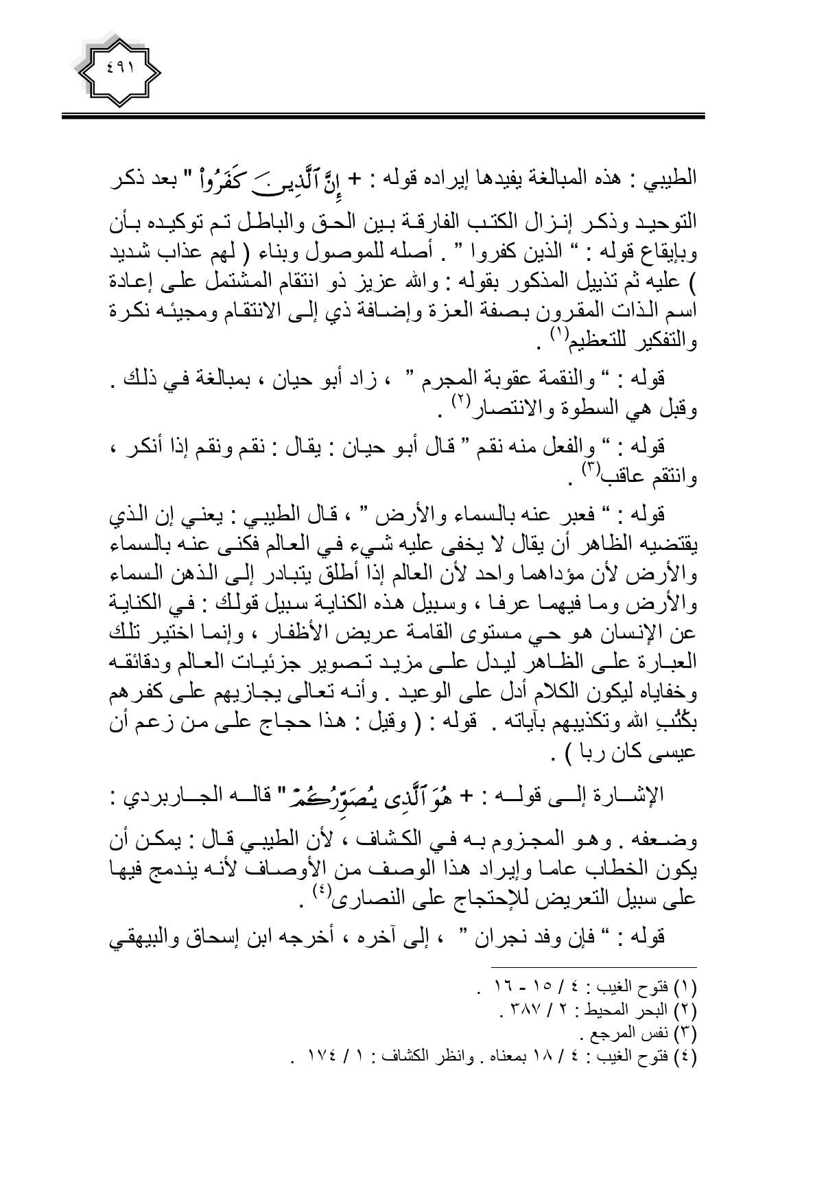 الطيبي: هذه المبالغة يفيدها إيراده قوله: {إِنَّ الَّذِينَ كَفَرُوا} بعد ذكر التوحيد وذكر إنزال الكتب الفارقة بين الحق والباطل تم توكيده بأن وبإيقاع قوله: " الذين كفروا ". أصله للموصول وبناء (لهم عذاب شديد) عليه ثم تذييل المذكور بقوله: والله عزيز ذو انتقام المشتمل على إعادة اسم الذات المقرون بصفة العزة وإضافة ذي إلى الانتقام ومجيئه نكرة والتفكير للتعظيم.