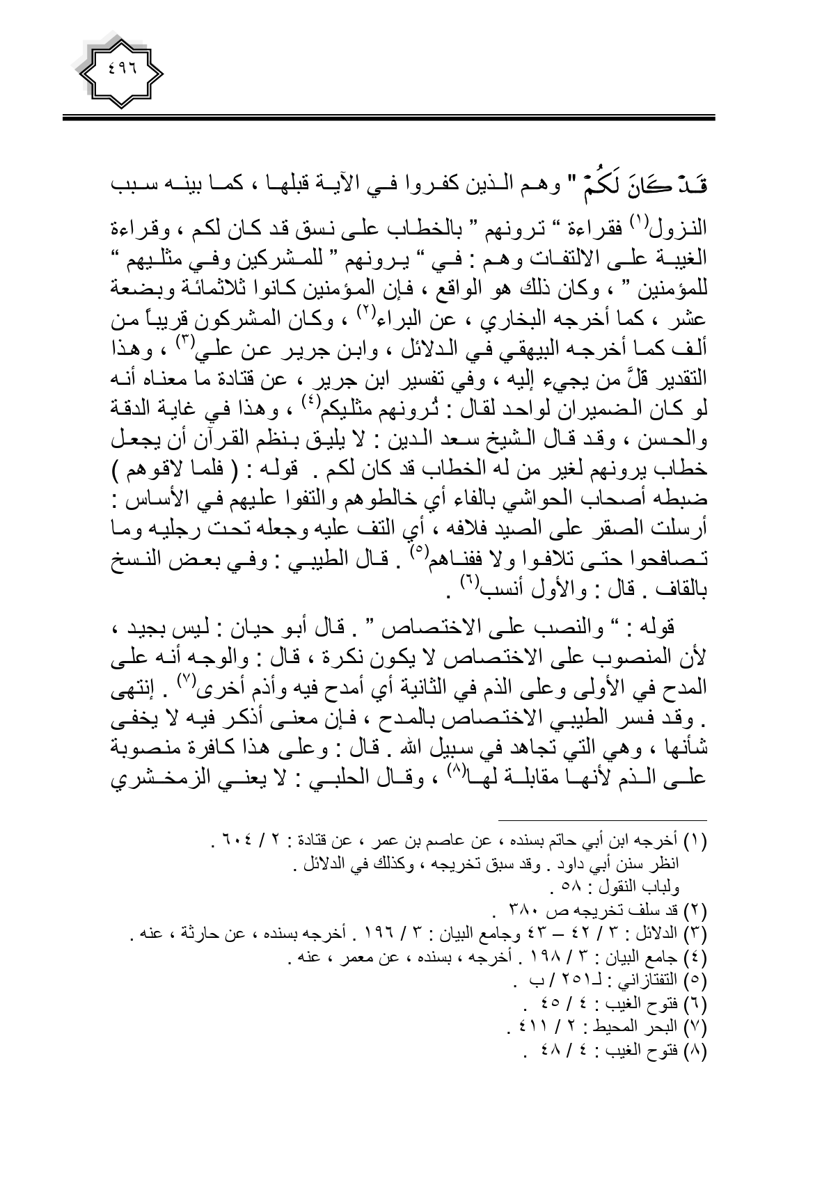 قَدْ كَانَ لَكُمْ} وهم الذين كفروا في الآية قبلها، كما بينه سبب النزول فقراءة " ترونهم " بالخطاب على نسق قد كان لكم، وقراءة الغيبة على الالتفات وهم: في " يرونهم " للمشركين وفي مثليهم " للمؤمنين "، وكان ذلك هو الواقع، فإن المؤمنين كانوا ثلاثمائة وبضعة عشر، كما أخرجه البخاري، عن البراء، وكان المشركون قريبا من ألف كما أخرجه البيهقي في الدلائل، وابن جرير عن علي، وهذا التقدير قل من يجيء إليه، وفي تفسير ابن جرير، عن قتادة ما معناه أنه لو كان الضميران لواحد لقال: ترونهم مثليكم، وهذا في غاية الدقة والحسن، وقد قال الشيخ سعد الدين: لا يليق بنظم القرآن أن يجعل خطاب يرونهم لغير من له الخطاب قد كان لكم. قوله: (فلما لاقوهم) ضبطه أصحاب الحواشي بالفاء أي خالطوهم والتفوا عليهم في الأساس: أرسلت الصقر على الصيد فلافه، أي التف عليه وجعله تحت رجليه وما تصافحوا حتى تلافوا ولا ففناهم. قال الطيبي: وفي بعض النسخ بالقاف. قال: والأول أنسب.