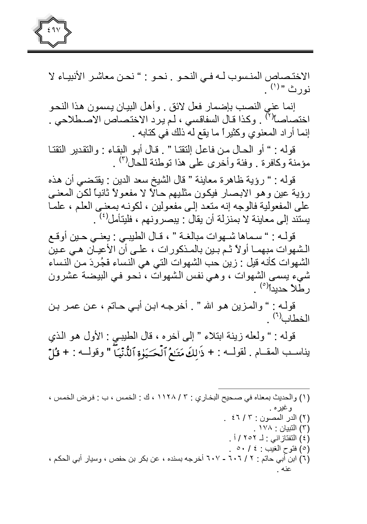 إنما عنى النصب بإضمار فعل لائق. وأهل البيان يسمون هذا النحو اختصاصا. وكذا قال السفاقسي، لم يرد الاختصاص الاصطلاحي. إنما أراد المعنوي وكثيراً ما يقع له ذلك في كتابه.
