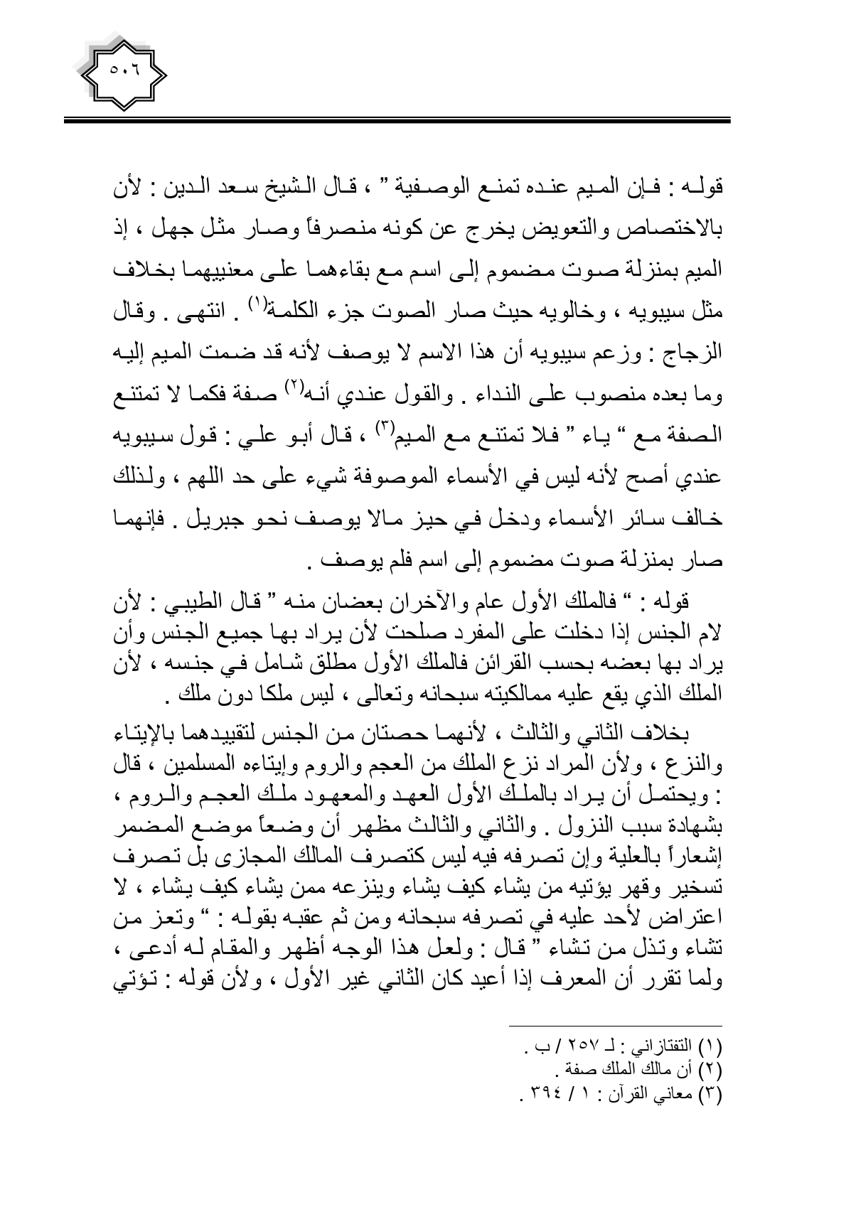 بخلاف الثاني والثالث، لأنهما حصتان من الجنس لتقييدهما بالايتاء والنزع، ولأن المراد نزع الملك من العجم والروم وإيتاءه المسلمين، قال: ويحتمل أن يراد بالملك الأول العهد والمعهود ملك العجم والروم، بشهادة سبب النزول. والثاني والثالث مظهر أن وضعا موضع المضمر إشعاراً بالعلية وإن تصرفه فيه ليس كتصرف المالك المجازي بل تصرف تسخير وقهر يؤتيه من يشاء كيف يشاء وينزعه ممن يشاء كيف يشاء، لا اعتراض لأحد عليه في تصرفه سبحانه ومن ثم عقبه بقوله: " وتعز من تشاء وتذل من تشاء " قال: ولعل هذا الوجه أظهر والمقام له أدعى، ولما تقرر أن المعرف إذا أعيد كان الثاني غير الأول، ولأن قوله: تؤتي