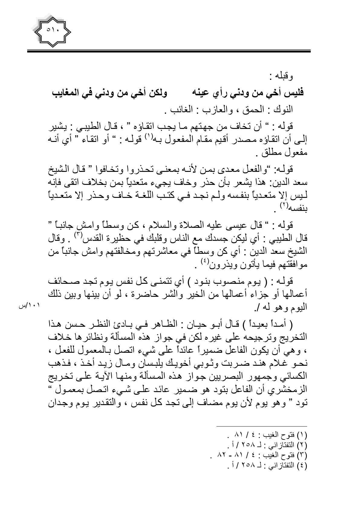 قوله: " والفعل معدى بمن لأنه بمعنى تحذروا وتخافوا " قال الشيخ سعد الدين: هذا يشعر بأن حذر وخاف يجيء متعديا بمن بخلاف اتقى فإنه ليس إلا متعديا بنفسه ولم نجد في كتب اللغة خاف وحذر إلا متعديا بنفسه.