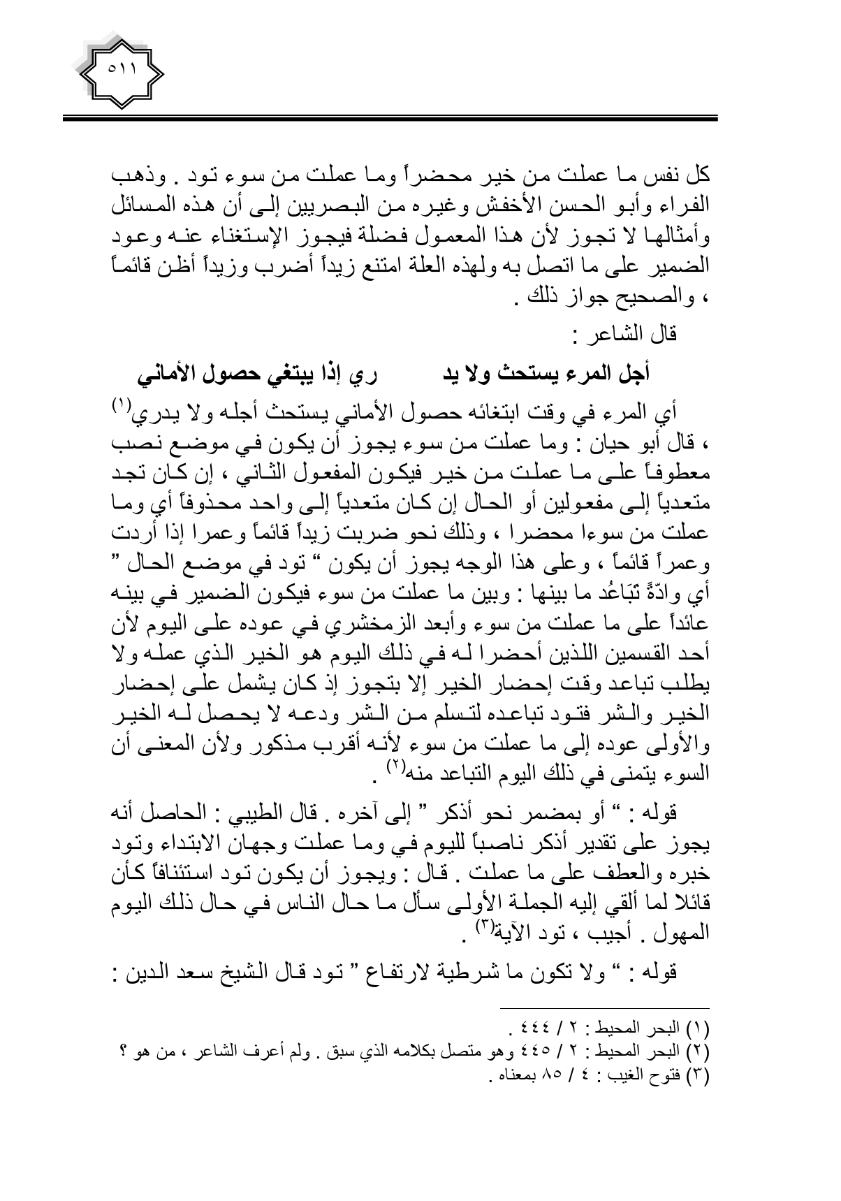 أي المرء في وقت ابتغائه حصول الأماني يستحث أجله ولا يدري، قال أبو حيان: وما عملت من سوء يجوز أن يكون في موضع نصب معطوفا على ما عملت من خير فيكون المفعول الثاني، إن كان تجد متعديا إلى مفعولين أو الحال إن كان متعديا إلى واحد محذوفا أي وما عملت من سوءا محضراً، وذلك نحو ضربت زيداً قائما وعمرا إذا أردت وعمراً قائما، وعلى هذا الوجه يجوز أن يكون " تود في موضع الحال " أي وادة تباعد ما بينها: وبين ما عملت من سوء فيكون الضمير في بينه عائداً على ما عملت من سوء وأبعد الزمخشري في عودة على اليوم لأن أحد القسمين اللذين أحضرا له في ذلك اليوم هو الخير الذي عمله ولا يطلب تباعد وقت إحضار الخير إلا بتجوز إذ كان يشمل على إحضار الخير والشر فتود تباعده لتسلم من الشر ودعه لا يحصل له الخير والأولى عوده إلى ما عملت من سوء لأنه أقرب مذكور ولأن المعنى أن السوء يتمنى في ذلك اليوم التباعد منه.
