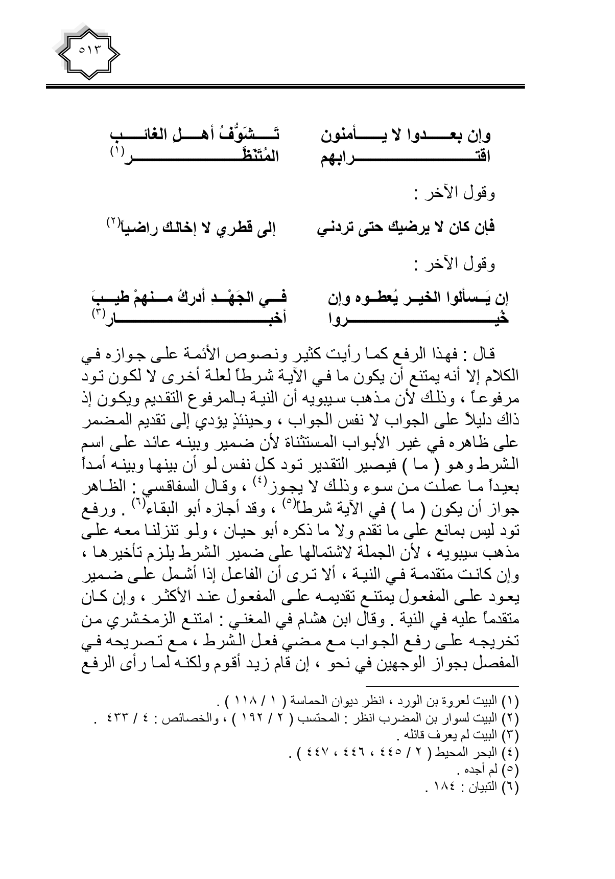 قال: فهذا الرفع كما رأيت كثير ونصوص الأئمة على جوازه في الكلام إلا أنه يمتنع أن يكون ما في الآية شرطا لعلة أخرى لا لكون تود مرفوعا، وذلك لأن مذهب سيبويه أن النية بالمرفوع التقديم ويكون إذ ذاك دليلا على الجواب لا نفس الجواب، وحينئذ يؤدي إلى تقديم المضمر على ظاهره في غير الأبواب المستثناة لأن ضمير وبينه عائد على اسم الشرط وهو (ما) فيصير التقدير تود كل نفس لو أن بينها وبينه أمدا بعيداً ما عملت من سوء وذلك لا يجوز، وقال السفاقسى: الظاهر جواز أن يكون (ما) في الآية شرطا، وقد أجازه أبو البقاء. ورفع تود ليس بمانع على ما تقدم ولا ما ذكره أبو حيان، ولو تنزلنا معه على مذهب سيبويه، لأن الجملة لاشتمالها على ضمير الشرط يلزم تأخيرها، وإن كانت متقدمة في النية، ألا ترى أن الفاعل إذا أشمل على ضمير يعود على المفعول يمتنع تقديمه على المفعول عند الأكثر، وإن كان متقدما عليه في النية. وقال ابن هشام في المغني: امتنع الزمخشري من تخريجه على رفع الجواب مع مضي فعل الشرط، مع تصريحه في المفصل بجواز الوجهين في نحو، إن قام زيد أقوم ولكنه لما رأى الرفع