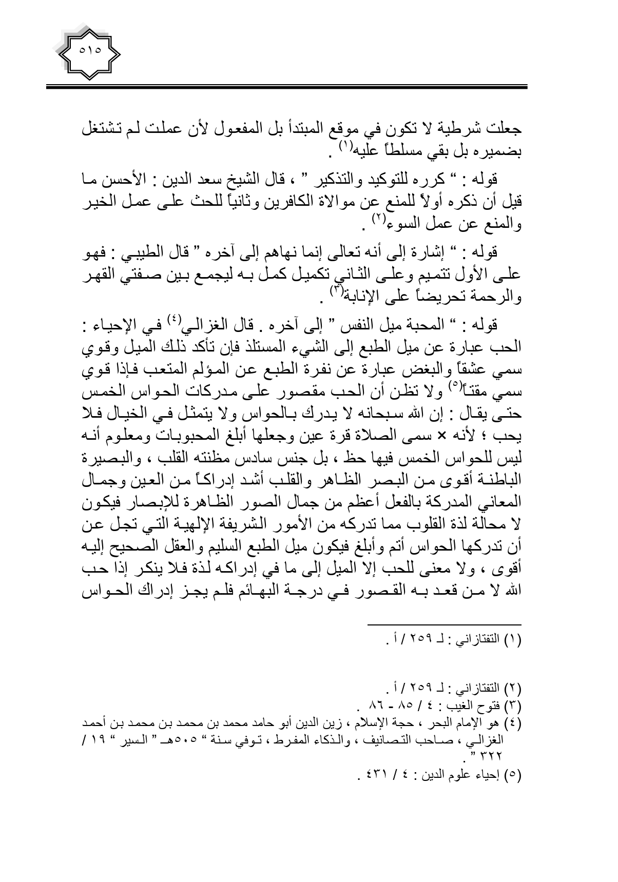 قوله: " المحبة ميل النفس " إلى آخره. قال الغزالي في الإحياء: الحب عبارة عن ميل الطبع إلى الشيء المستلذ فإن تأكد ذلك الميل وقوي سمي عشقا والبغض عبارة عن نفرة الطبع عن المؤلم المتعب ماذا قوي سمي مقتا ولا تظن أن الحب مقصور على مدركات الحواس الخمس حتى يقال: إن الله سبحانه لا يدرك بالحواس ولا يتمثل في الخيال فلا يحب؛ لأنه - صلى الله عليه وسلم - سمى الصلاة قرة عين وجعلها أبلغ المحبوبات ومعلوم أنه ليس للحواس الخمس فيها حظ، بل جنس سادس مظنته القلب، والبصيرة الباطنة أقوى من البصر الظاهر والقلب أشد إدراكا من العين وجمال المعاني المدركة بالفعل أعظم من جمال الصور الظاهرة للإبصار فيكون لا محالة لذة القلوب مما تدركه من الأمور الشريفة الإلهية التي تجل عن أن تدركها الحواس أتم وأبلغ فيكون ميل الطبع السليم والعقل الصحيح إليه أقوى، ولا معنى للحب إلا الميل إلى ما في إدراكه لذة فلا ينكر إذا حب الله لا من قعد به القصور في درجة البهائم في يجز إدراك الحواس