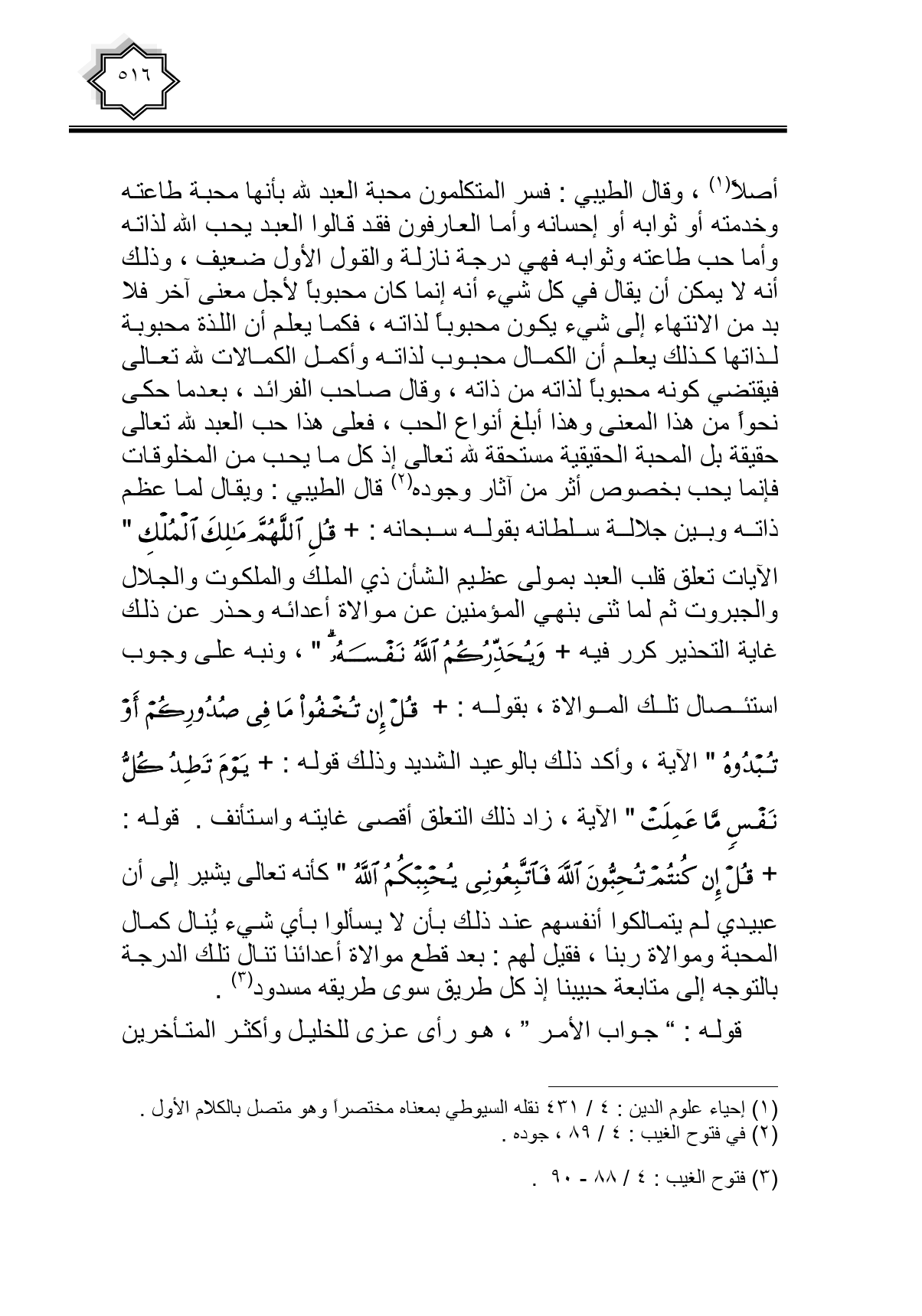 أصلا، وقال الطيبي: فسر المتكلمون محبة العبد لله بأنها محبة طاعته وخدمته أو ثوابه أو إحسانه وأما العارفون فقد قالوا العبد يحب الله لذاته وأما حب طاعته وثوابه فهي درجة نازلة والقول الأول ضعيف، وذلك أنه لا يمكن أن يقال في كل شيء أنه إنما كان محبوبا لأجل معنى أخر فلا بد من الانتهاء إلى شيء يكون محبوبا لذاته، فكما يعلم أن اللذة محبوبة لذاتها كذلك يعلم أن الكمال محبوب لذاته وأكمل الكمالات لله تعالى فيقتضي كونه محبوبا لذاته من ذاته، وقال صاحب الفرائد، بعدما حكى نحواً من هذا المعنى وهذا أبلغ أنواع الحب، فعلى هذا حب العبد لله تعالى حقيقة بل المحبة الحقيقية مستحقة لله تعالى إذ كل ما يحب من المخلوقات فإنما يحب بخصوص أثر من آثار وجوده قال الطيبي: ويقال لما عظم ذاته وبين جلالة سلطانه بقوله سبحانه: {قُلِ اللَّهُمَّ مَالِكَ الْمُلْكِ} الآيات تعلق قلب العبد بمولى عظيم الشأن ذي الملك والملكوت والجلال والجبروت ثم لما ثني بنهي المؤمنين عن موالاة أعدائه وحذر عن ذلك غاية التحذير كرر فيها {وَيُحَذِّرُكُمُ اللَّهُ نَفْسَهُ}، ونبه على وجوب استئصال تلك الموالاة، بقوله: {قُلْ إِنْ تُخْفُوا مَا فِي صُدُورِكُمْ أَوْ تُبْدُوهُ} الآية، وأكد ذلك بالوعيد الشديد وذلك قوله: {يَوْمَ تَجِدُ كُلُّ نَفْسٍ مَا عَمِلَتْ} الآية، زاد ذلك التعلق أقصى غايته واستأنف. قوله: {قُلْ إِنْ كُنْتُمْ تُحِبُّونَ اللَّهَ فَاتَّبِعُونِي يُحْبِبْكُمُ اللَّهُ} كأنه تعالى يشير إلى أن عبيدي لم يتمالكوا أنفسهم عند ذلك بأن لا يسألوا بأي شيء ينال كمال المحبة وموالاة ربنا، فقيل لهم: بعد قطع موالاة أعدائنا تنال تلك الدرجة بالتوجه إلى متابعة حبيبنا إذ كل طريق سوى طريقه مسدود.