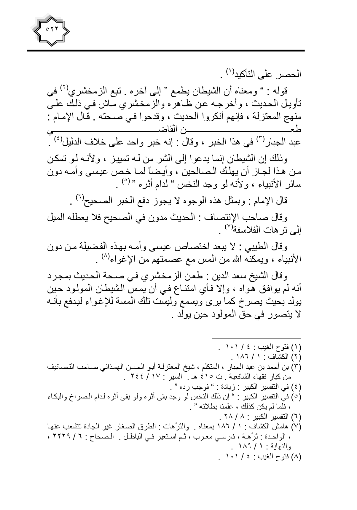 وقال الشيخ سعد الدين: طعن الزمخشري في صحة الحديث بمجرد أنه لم يوافق هواه، وإلا فأي امتناع في أن يمس الشيطان المولود حين يولد بحيث يصرخ كما يرى ويسمع وليست تلك المسة للإغواء ليدفع بأنه لا يتصور في حق المولود حين يولد.