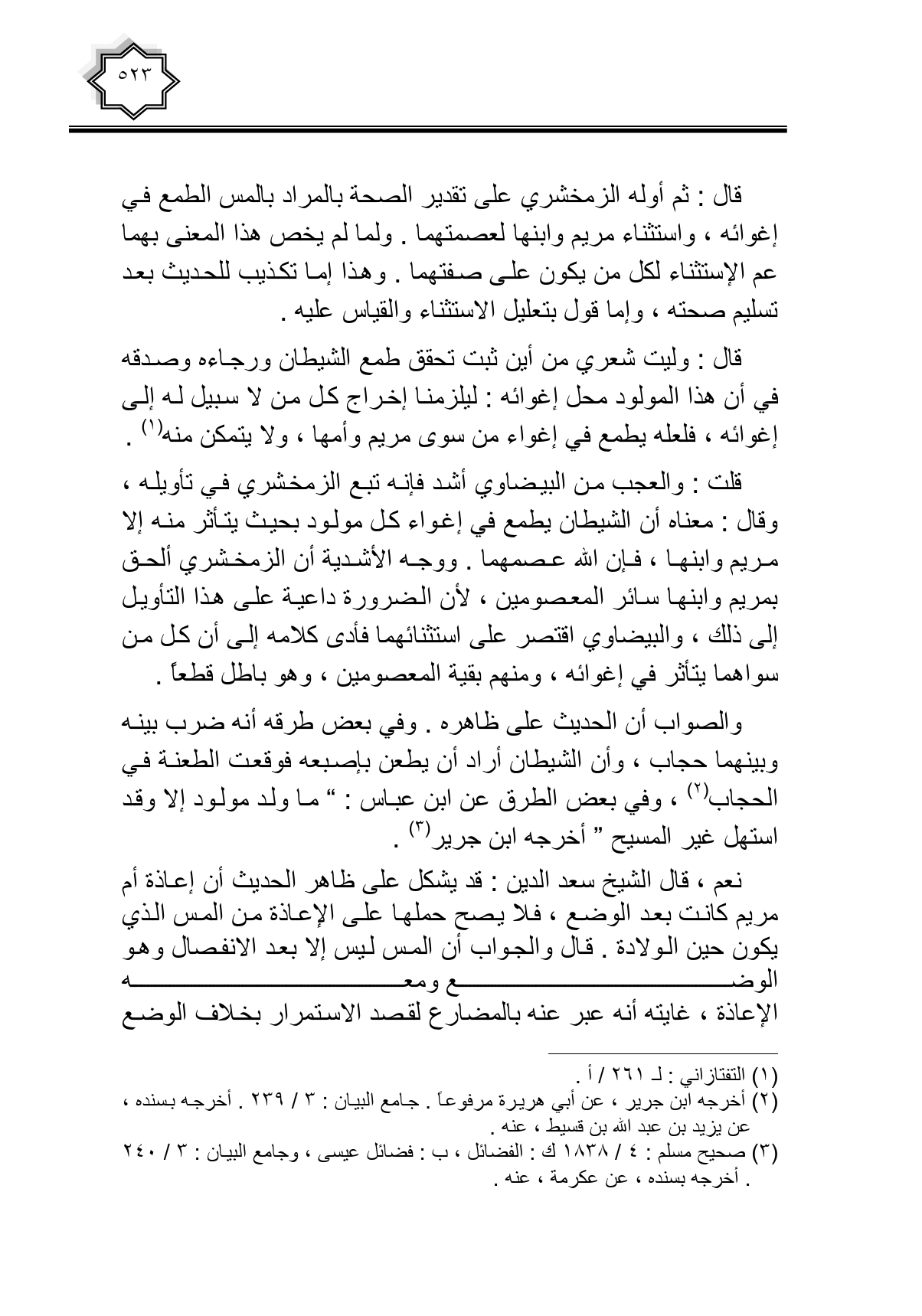 قلت: والعجب من البيضاوي أشد فإنه تبع الزمخشري في تأويله، وقال: معناه أن الشيطان يطمع في إغواء كل مولود بحيث يتأثر منه إلا مريم وابنها، فإن الله عصمهما. ووجه الأشدية أن الزمخشري ألحق بمريم وابنها سائر المعصومين، لأن الضرورة داعية على هذا التأويل إلى ذلك، والبيضاوي اقتصر على استثنائهما فأدى كلامه إلى أن كل من سواهما يتأثر في إغوائه، ومنهم بقية المعصومين، وهو باطل قطعا.