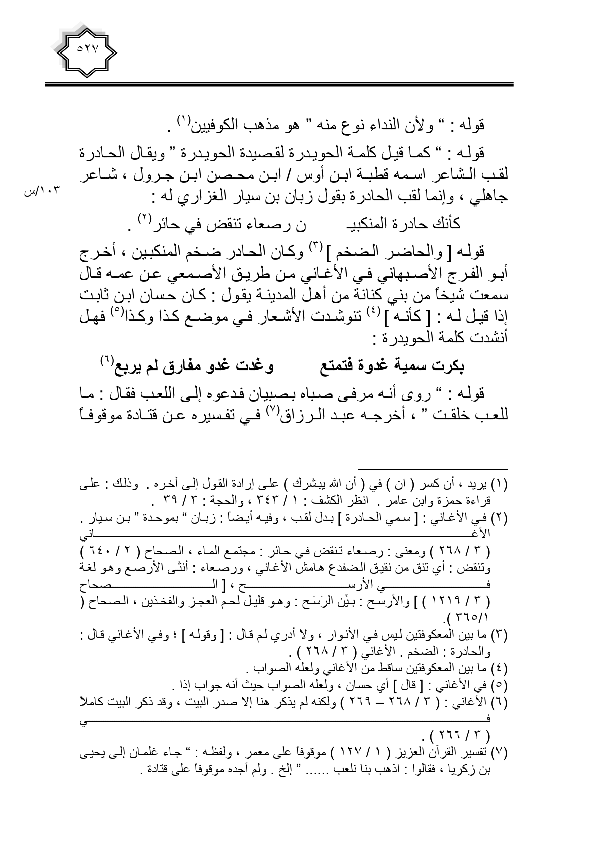 قوله: " كما قيل كلمة الحويدرة لقصيدة الحويدرة " ويقال الحادرة لقب الشاعر اسمه قطبة ابن أوس/ ابن محصن ابن جرول، شاعر جاهلي، وإنما لقب الحادرة بقول زبان بن سيار الغزاري له:
