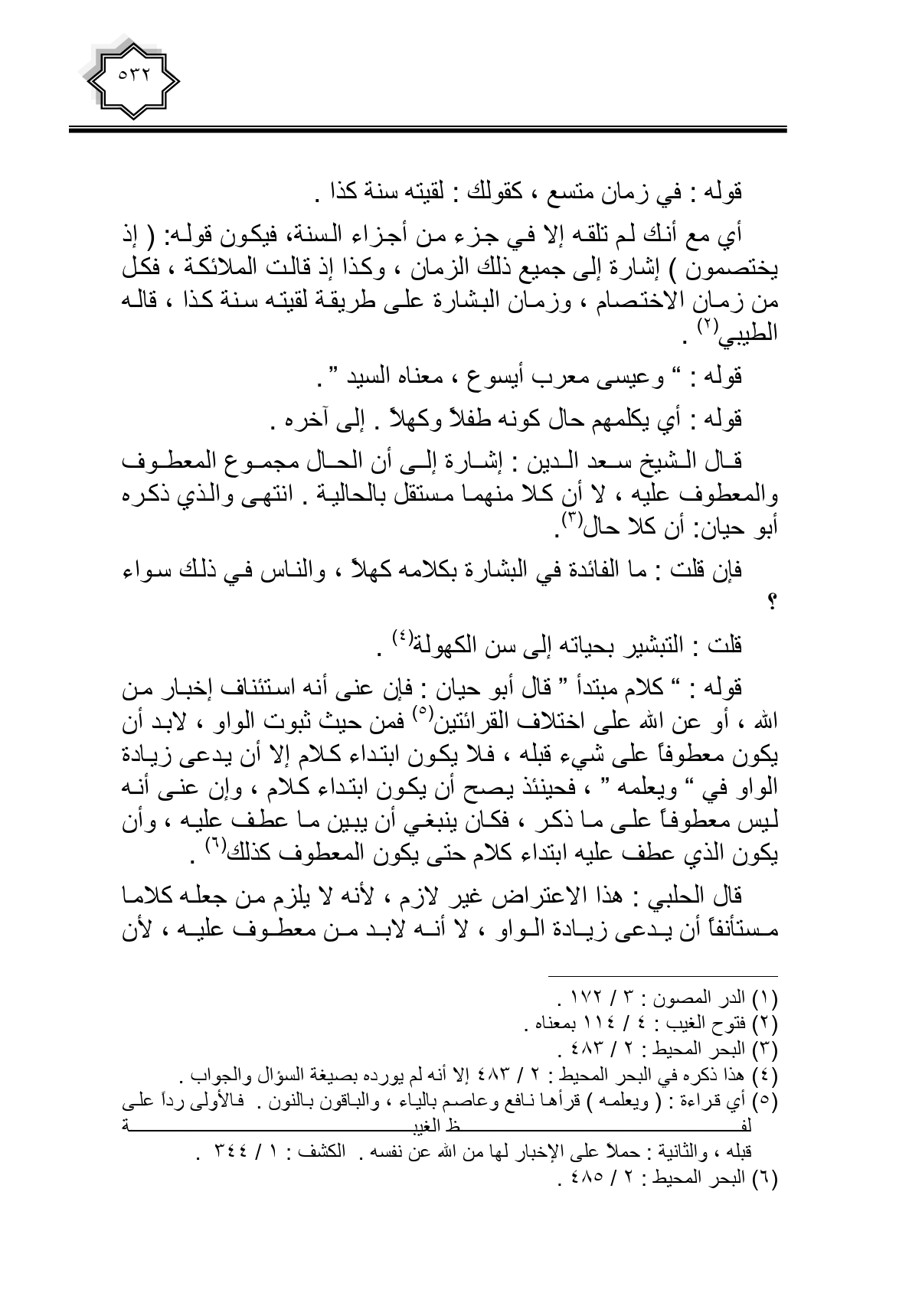 قوله: " كلام مبتدأ " قال أبو حيان: فإن عنى أنه استئناف إخبار من الله، أو عن الله على اختلاف القرائتين فمن حيث ثبوت الواو، لابد أن يكون معطوفا على شيء قبله، فلا يكون ابتداء كلام إلا أن يدعى زيادة الواو في " ويعلمه "، فحينئذ يصح ان يكون ابتداء كلام، وإن عنى أنه ليس معطوفا على ما ذكر، فكان ينبغي أن يبين ما عطف عليه، وأن يكون الذي عطف عليه ابتداء كلام حتى يكون المعطوف كذلك.
