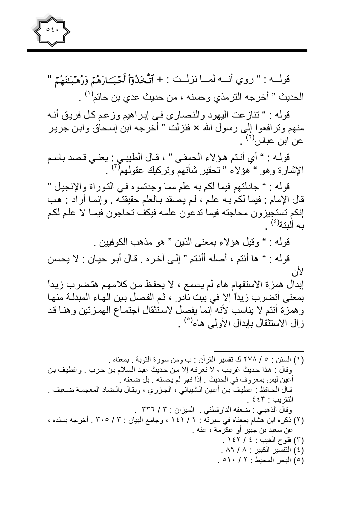 قوله: " روي أنه لما نزلت: {اتَّخَذُوا أَحْبَارَهُمْ وَرُهْبَانَهُمْ} الحديث " أخرجه الترمذي وحسنه، من حديث عدي بن حاتم.