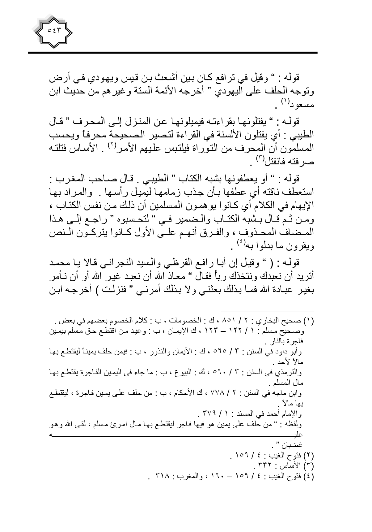 قوله: " أو يعطفونها بشبه الكتاب " الطيبي. قال صاحب المغرب: استعطف ناقته أي عطفها بأن جذب زمامها ليميل رأسها. والمراد بها الإيهام في الكلام أي كانوا يوهمون المسلمين أن ذلك من نفس الكتاب، ومن ثم قال بشبه الكتاب والضمير في " لتحسبوه " راجع إلى هذا المضاف المحذوف، والفرق أنهم على الأول كانوا يتركون النص ويقرون ما بدلوا به.
