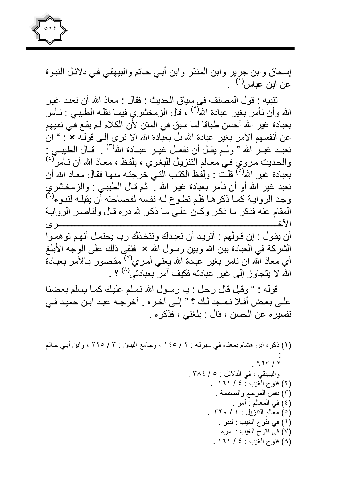 تنبيه: قول المصنف في سياق الحديث: فقال: معاذ الله أن نعبد غير الله وأن نأمر بغير عبادة الله، قال الزمخشري فيما نقله الطيبي: نأمر بعبادة غير الله أحسن طباقا لما سبق في المتن لأن الكلام لم يقع في نفيهم عن أنفسهم الأمر بغير عبادة الله بل بعبادة الله ألا ترى إلى قوله - صلى الله عليه وسلم -: " أن نعبد غير الله " ولم يقل أن نفعل غير عبادة الله. قال الطيبي: والحديث مروي في معالم التنزيل للبغوي، بلفظ، معاذ الله أن نأمر بعبادة غير الله قلت: ولفظ الكتب التي خرجته منها فقال معاذ الله أن نعبد غير الله أو أن نأمر بعبادة غير الله. ثم قال الطيبي: والزمخشري وجد الرواية كما ذكرها فلم تطوع له نفسه لفصاحته أن يقبله لنبوء المقام عنه فذكر ما ذكر وكان على ما ذكر لله دره قال ولناصر الرواية الأخرى أن يقول: إن قولهم: أتريد أن نعبدك ونتخذك ربا يحتمل أنهم توهموا الشركة في العبادة بين الله وبين رسول الله - صلى الله عليه وسلم - فنفى ذلك على الوجه الأبلغ أي معاذ الله أن نأمر بغير عبادة الله يعني أمري مقصور بالأمر بعبادة الله لا يتجاوز إلى غير عبادته فكيف أمر بعبادتي؟.