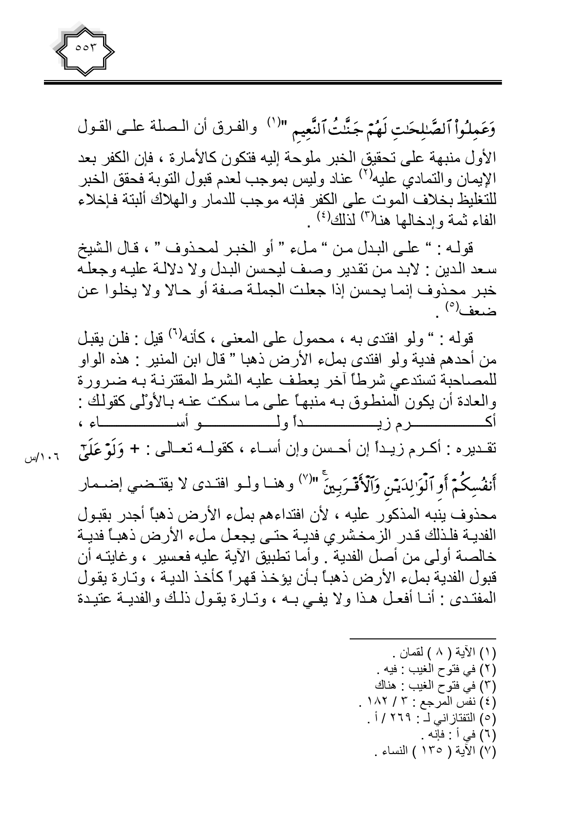 قوله: " ولو افتدى به، محمول على المعنى، كأنه قيل: فلن يقبل من أحدهم فدية ولو افتدى بملء الأرض ذهبا " قال ابن المنير: هذه الواو للمصاحبة تستدعي شرطا آخر يعطف عليه الشرط المقترنة به ضرورة والعادة أن يكون المنطوق به منبها على ما سكت عنه بالأولى كقولك: أكرم زيداً ولو أساء، تقديره: أكرم زيدا إن أحسن وإن أساء، كقوله تعالى: {وَلَوْ عَلَى أَنْفُسِكُمْ أَوِ الْوَالِدَيْنِ وَالْأَقْرَبِينَ} وهنا ولو افتدى لا يقتضي إضمار محذوف ينبه المذكور عليه، لأن افتداءهم بملء الأرض ذهبا أجدر بقبول الفدية فلذلك قدر الزمخشري فدية حتى يجعل ملء الأرض ذهبا فدية خالصة أولى من أصل الفدية. وأما تطبيق الآية عليه فعسير، وغايته أن قبول الفدية بملء الأرض ذهبا بأن يؤخذ قهراً كأخذ الدية، وتارة يقول المفتدى: أنا أفعل هذا ولا يفي به، وتارة يقول ذلك والفدية عتيدة
