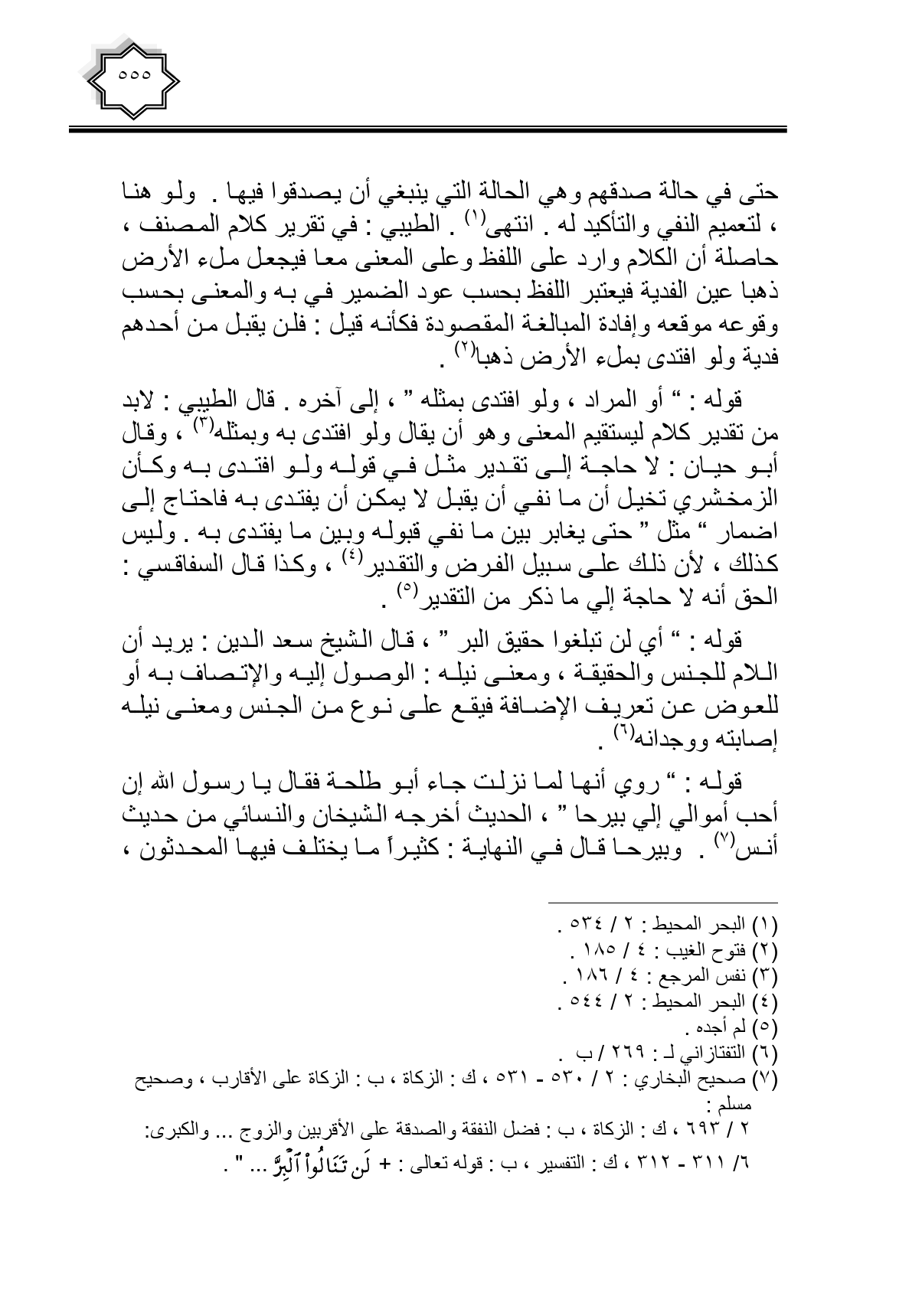 قوله: " روي أنها لما نزلت جاء أبو طلحة فقال يا رسول الله إن أحب أموالي إلى بيرحا "، الحديث أخرجه الشيخان والنسائي من حديث أنس. وبيرحا قال في النهاية: كثيرا ما يختلف فيها المحدثون،