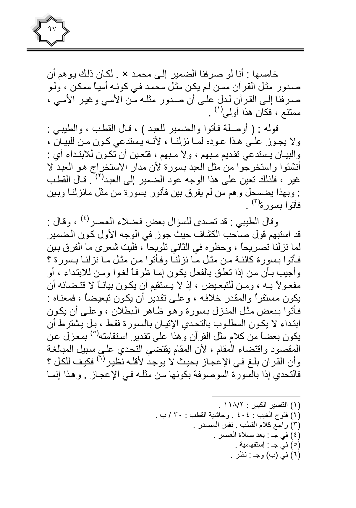 خامسها: أنا لو صرفنا الضمير إلى محمد. لكان ذلك يوهم أن صدور مثل القرآن ممن لم يكن مثل محمد في كونه أمياً ممكن، ولو صرفنا إلى القرآن لدل على أن صدور مثله من الأمي وغير الأمي، ممتنع، فكان هذا أولى.