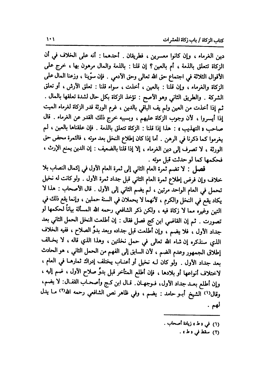 دين الغرماء، وإن كانوا معسرين، فطريقان. أحدهما: أنه على الخلاف في أن الزكاة تتعلق بالذمة، أم بالعين ؟ إن قلنا: بالذمة والمال مرهون بها، خرج على الاقوال الثلاثة في اجتماع حق الله تعالى وحق الآدمي. فإن سوينا، وزعنا المال على الزكاة والغرماء، وإن قلنا: بالعين، أخذت، سواء قلنا: تعلق الارش، أو تعلق الشركة. والطريق الثاني وهو الاصح: تؤخذ الزكاة بكل حال لشدة تعلقها بالمال. ثم إذا أخذت من العين ولم يف الباقي بالدين، غرم الورثة قدر الزكاة لغرماء الميت إذا أيسروا، لان وجوب الزكاة عليهم، وبسببه خرج ذلك القدر عن الغرماء. قال صاحب التهذيب: هذا إذا قلنا: الزكاة تتعلق بالذمة. فإن علقناها بالعين، لم يغرموا كما ذكرنا في الرهن. أما إذا كان إطلاع النخل بعد موته، فالثمرة محض حق الورثة، لا تصرف إلى دين الغرماء، إلا إذا قلنا بالضعيف: إن الدين يمنع الارث، فحكمها كما لو حدثت قبل موته. فصل لا تضم ثمرة العام الثاني إلى ثمرة العام الاول في إكمال النصاب بلا خلاف وإن فرض إطلاع ثمرة العام الثاني قبل جداد ثمرة الاول. ولو كانت له نخيل تحمل في العام الواحد مرتين، لم يضم الثاني إلى الاول. قال الاصحاب: هذا لا يكاد يقع في النخل والكرم، لانهما لا يحملان في السنة حملين، وإنما يقع ذلك في التين وغيره مما لا زكاة فيه، ولكن ذكر الشافعي رحمه الله المسألة بيانا لحكمها لو تصورت. ثم إن القاضي ابن كج فصل فقال: إن أطلعت النخل الحمل الثاني بعد جداد الاول، فلا يضم، وإن أطلعت قبل جداده وبعد بدو الصلاح، ففيه الخلاف الذي سنذكره إن شاء الله تعالى في حمل نخلتين، وهذا الذي قاله، لا يخالف إطلاق الجمهور عدم الضم، لان السابق إلى الفهم من الحمل الثاني، هو الحادث بعد جداد الاول. ولو كان له نجيل أو أعناب يختلف إدراك ثمارها في العام، لاختلاف أنواعها أو بلادها، فإن أطلع المتأخر قبل بدو صلاح الاول، ضم إليه، وإن أطلع بعد جداد الاول، فوجهان. قال ابن كج وأصحاب القفال: لا يضم، وقال أصحاب الشيخ أبي حامد: يضم، وفي ظاهر نص الشافعي ما يدل لهم.