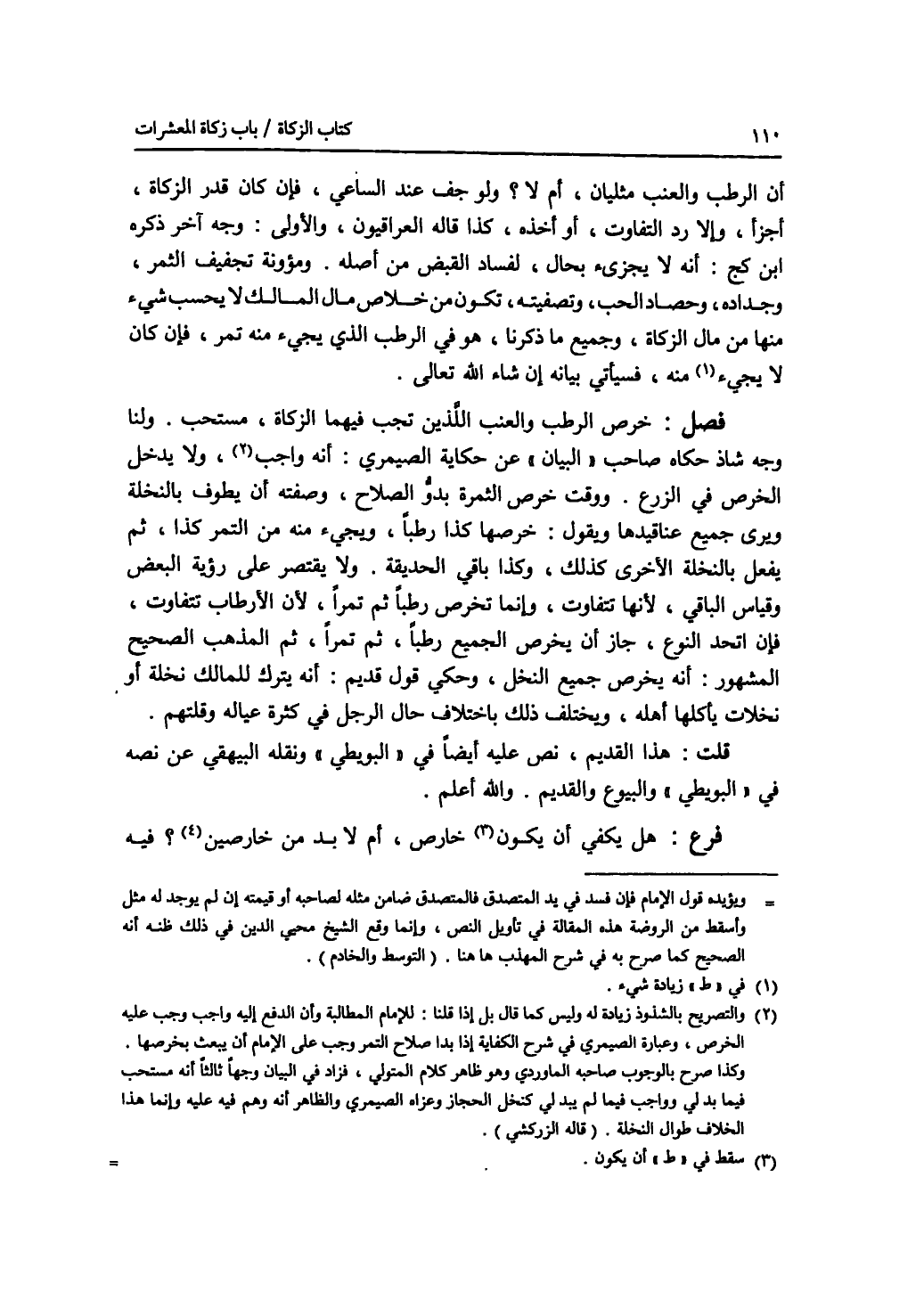 أن الرطب والعنب مثليان، أم لا ؟ ولو جف عند الساعي، فإن كان قدر الزكاة، أجزأ، وإلا رد التفاوت، أو أخذه، كذا قاله العراقيون، والاولى: وجه آخر ذكره ابن كج: أنه لا يجزئ بحال، لفساد القبض من أصله، ومؤونة تجفيف الثمر، وجداده، وحصاد الحب، وتصفيته، تكون من خلاص مال المالك لا يحسب شئ منها من مال الزكاة، وجميع ما ذكرنا، هو في الرطب الذي يجئ منه تمر، فإن كان لا يجئ شئ منه، فسيأتي بيانه إن شاء الله تعالى. فصل خرص الرطب والعنب اللذين تجب فيهما الزكاة، مستحب. ولنا وجه شاذ حكاه صاحب البيان عن حكاية الصيمري: أنه واجب، ولا يدخل الخرص في الزرع. ووقت خرص الثمرة بدو الصلاح، وصفته أن يطوف بالنخلة ويرى جميع عناقيدها ويقول: خرصها كذا رطبا، ويجئ منه من التمر كذا، ثم يفعل بالنخلة الاخرى كذلك، وكذا باقي الحديقة. ولا يقتصر على رؤية البعض وقياس الباقي، لانها تتفاوت، وإنما تخرص رطبا ثم تمرا، لان الارطاب تتفاوت، فإن اتحد النوع، جاز أن يخرص الجميع رطبا، ثم تمرا، ثم المذهب الصحيح المشهور: أنه يخرص جميع النخل، وحكي قول قديم: أنه يترك للمالك نخلة أو نخلات يأكلها أهله، ويختلف ذلك باختلاف حال الرجل في كثرة عياله وقلتهم. قلت: هذا القديم، نص عليه أيضا في البويطي ونقله البيهقي عن نصه في البويطي والبيوع والقديم. والله أعلم. فرع هل يكفي خارص، أم لا بد من خارصين ؟ فيه